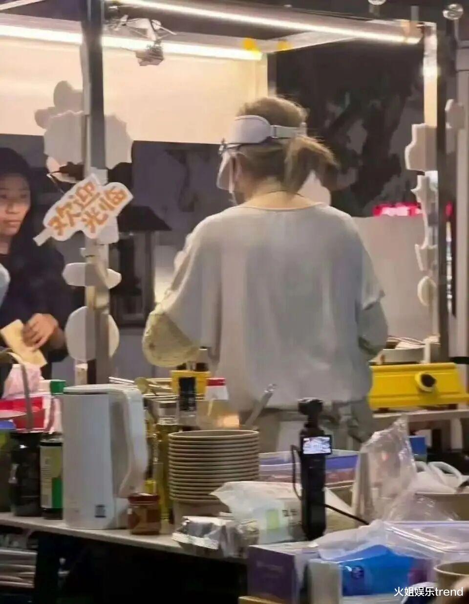 只见赵露思游刃有余的驾驭两个平底锅、在简易调料台上,娴熟地调蛋烘糕的面糊、加料打包所有操作亲力亲为,虽然动作生疏但认真专注。