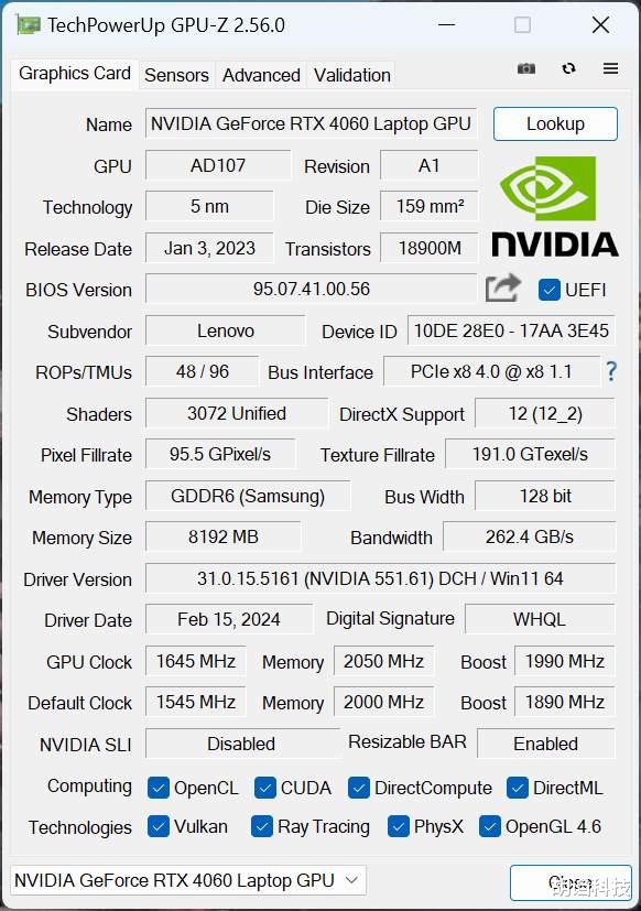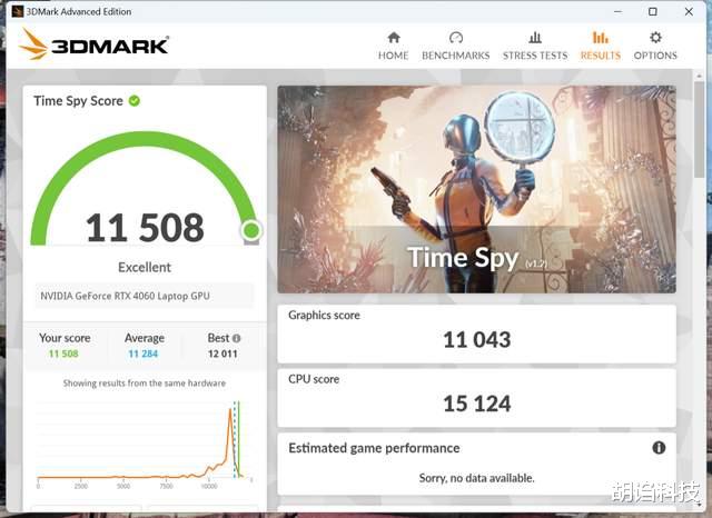 这颗GeForce RTX4060 Laptop在3DMark Fire Strike中可以达到26000分。TimeSpy也有11508分,性能表现不错,是满血RTX4060的水平。