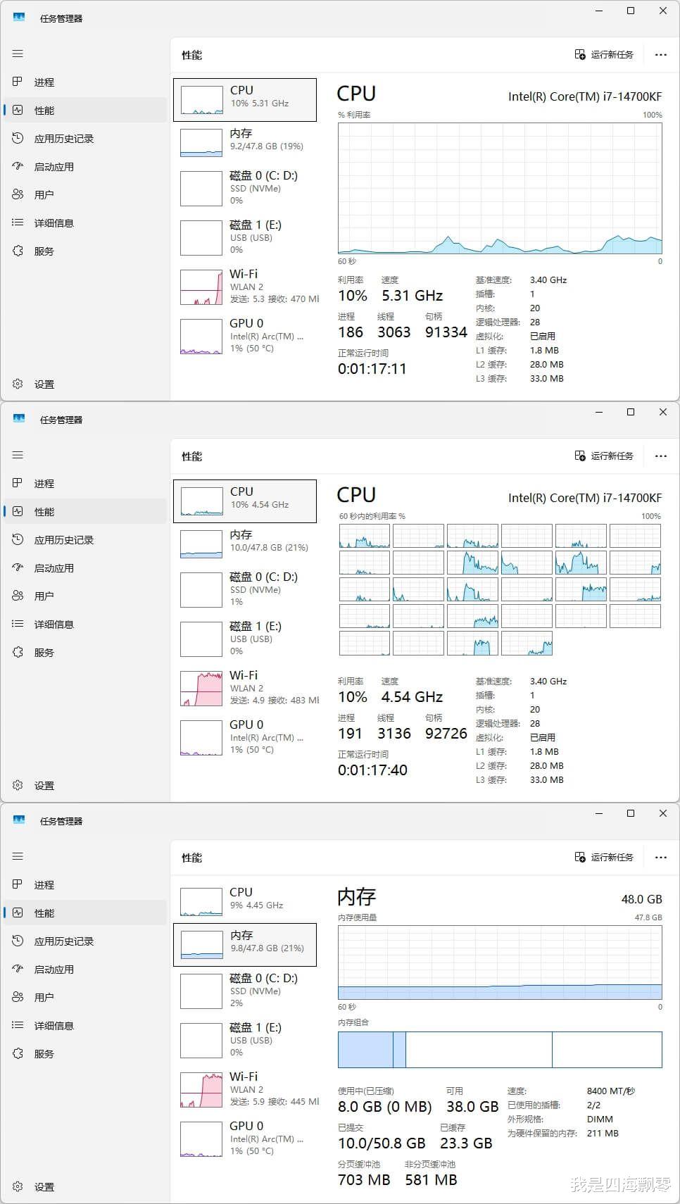 在Windows 11的任务管理器中可以确认,内存已稳定工作在8400 MT/s的速率上,这相当于达到了DDR5-8400的内存频率。