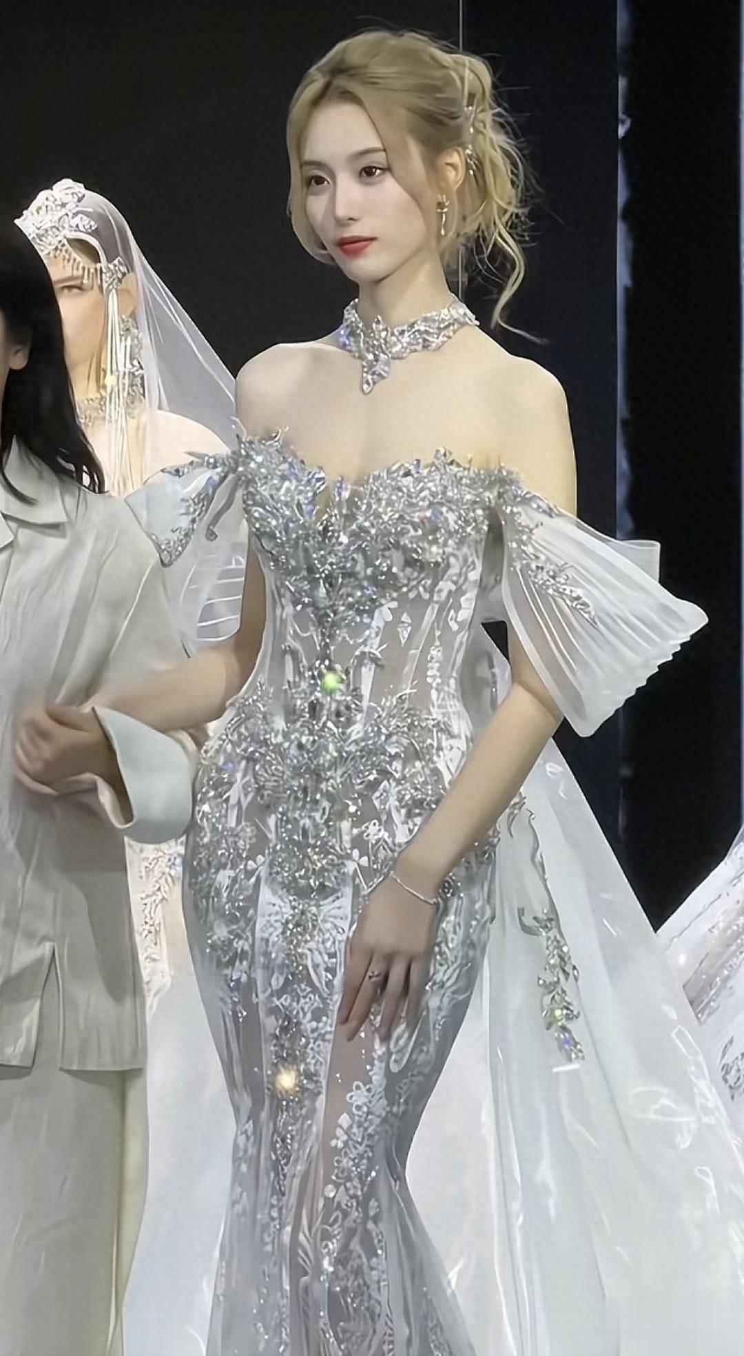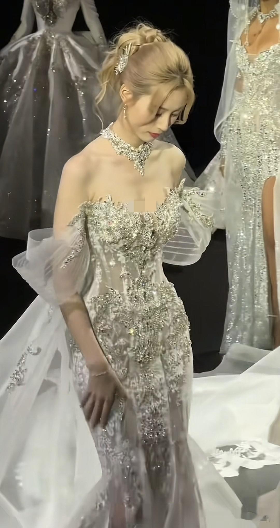 徐艺洋在三亚时装周,一身水晶缀饰的露肩婚纱,轻盈薄纱配璀璨细节,华丽又优雅,气质好,在秀场