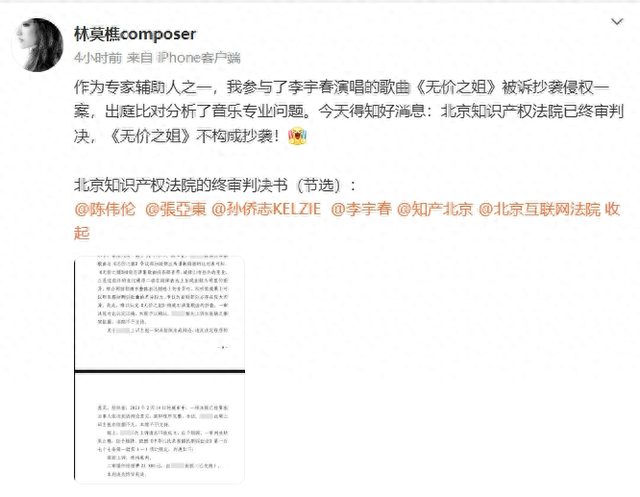 7月8日,作曲家@林莫樵composer晒出@李宇春《无价之姐》侵权案终审判决书内容,经北京知识产权法院审查,认定《无价之姐》与歌曲《跟我出发》不构成实质性相似。