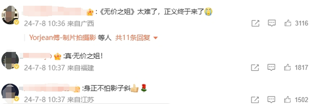 4年后,《无价之姐》终于以一纸终审判决,洗刷了“抄袭”指控。在新浪娱乐微博下的热搜中,能看到“《无价之姐》太难了,正义终于来了”这样的热评,也有人用《无价之姐》的歌词“一个女性成长要历经多少风暴,做自己才不是一句简单的口号”回复,引发不少共鸣。