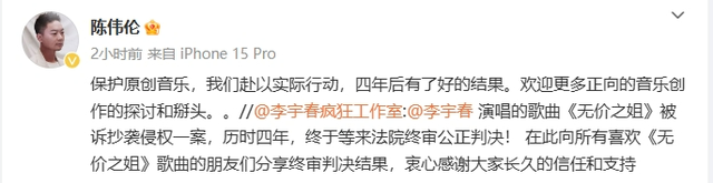 李宇春工作室转发了新闻内容并表示:“ 在此向所有喜欢《无价之姐》歌曲的朋友们分享终审判决结果,衷心感谢大家长久的信任和支持。”制作人陈伟伦也在转发中说:“保护原创音乐,我们赴以实际行动,四年后有了好的结果。欢迎更多正向的音乐创作的探讨和掰头。”