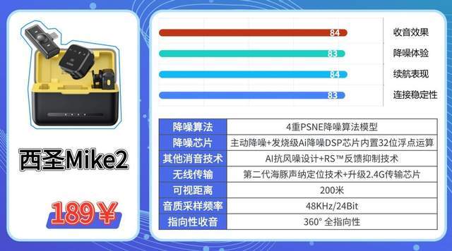 西圣Mike2主打同价位降噪X能标杆,采用进口6mm镀镍高灵敏音头,提升人声拾取清晰度和还原度。配备发烧级AI降噪芯片,搭配4重PSNE分层降噪算法;采用第二代海豚声纳定位技术+升级2.4G传输芯片双重保障,提升复杂环境下的信号稳定X。