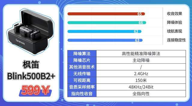 枫笛Blink500B2+定位多人创作专用机型,自主研发6mm全向型咪头,搭配360°环绕拾音设计,提升收声均匀度。优化2.4G数字传输技术,增强抗干扰X;支持一拖二双声道收音,提升后期剪辑灵活X。