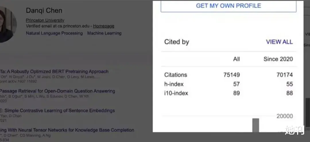 陈丹琦的论文被引用超7万次