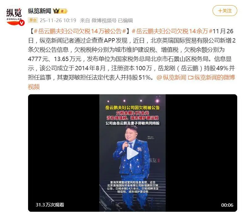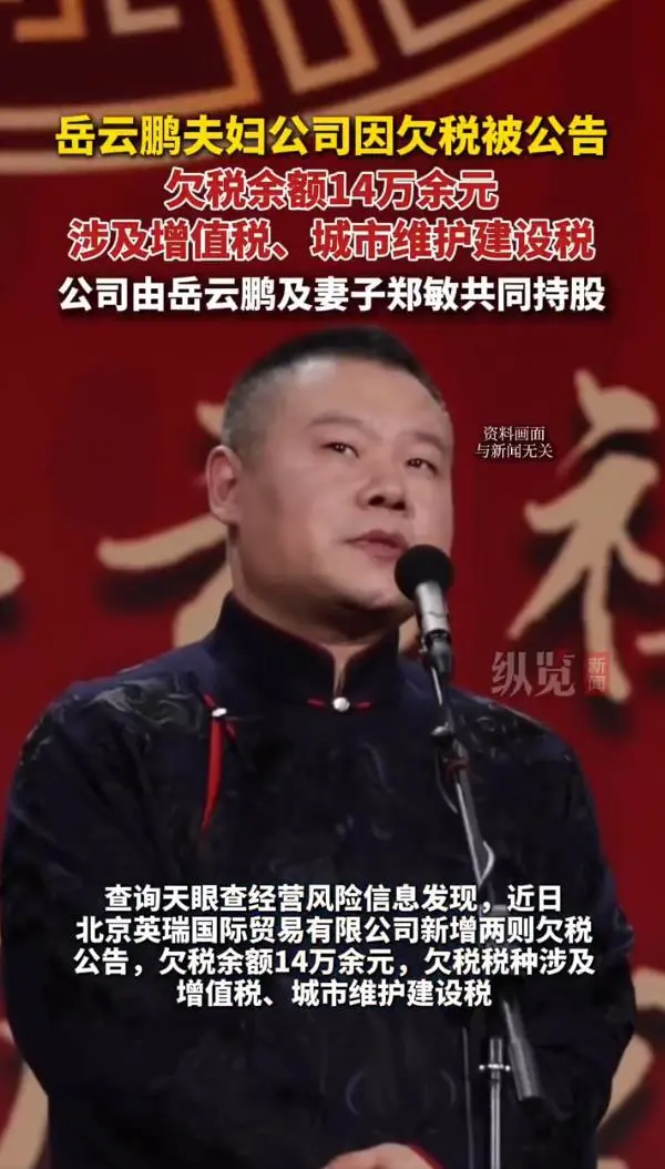 “岳云鹏怎么也会栽在税务上?”11月29日,国家税务总局北京市税务局官网更新的“欠税公告”,让相声圈炸开了锅——岳云鹏妻子郑敏持股99%的北京星聚艺文化传媒有限公司,因欠缴增值税12.4万元、城市维护建设税1.63万元,合计14.03万元被实名公示,公示期从11月28日持续至12月12日,逾期将面临强制执行。#岳云鹏夫妇公司欠税14万##岳云鹏别踩税务底线#话题单日阅读破9亿,评论区“亲民滤镜碎了”的声音与“可能是财务疏忽”的辩解吵翻,网友直言“赚再多也别碰税务红线,这是底线”。