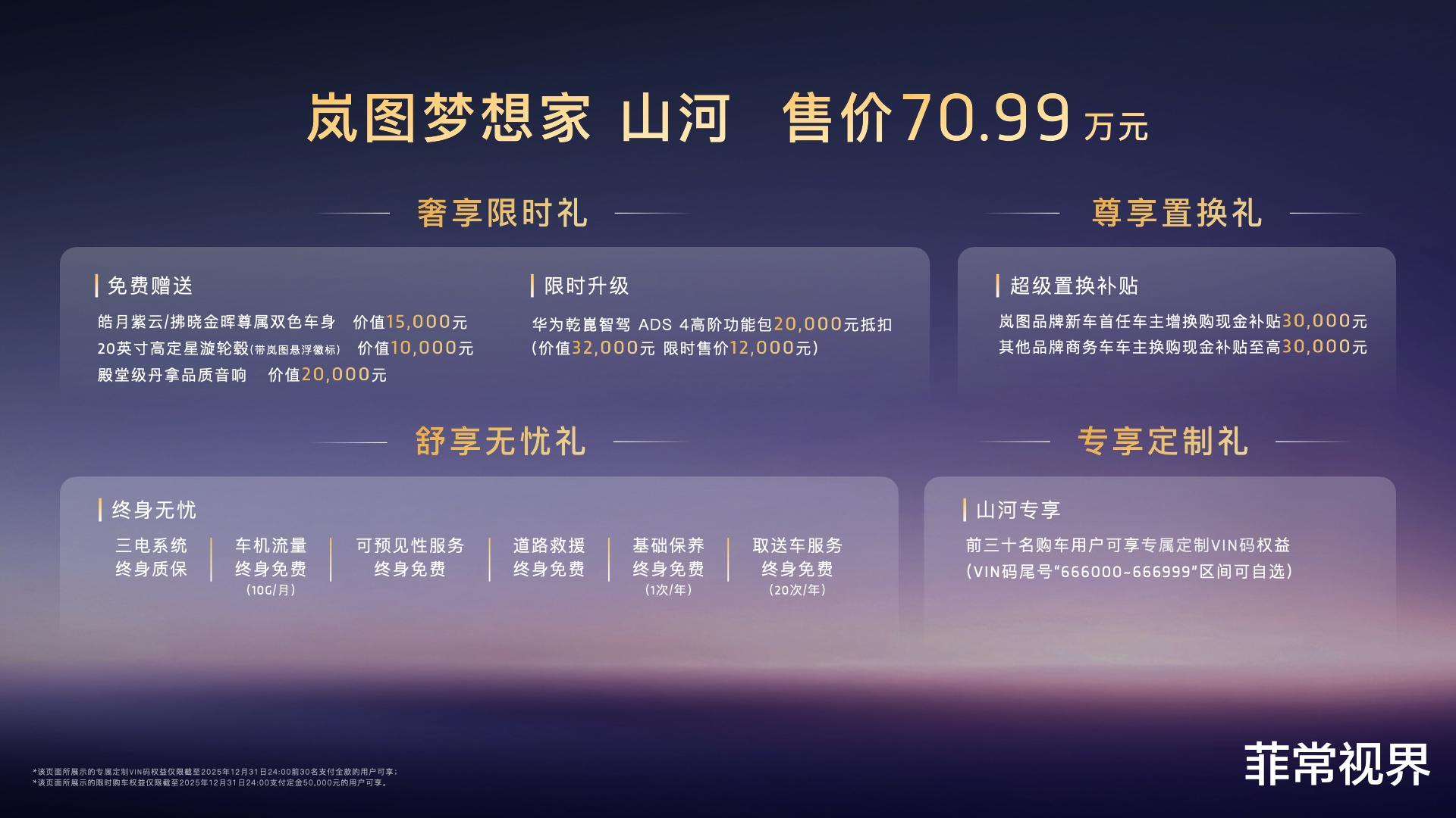 11月21日,广州车展盛大启幕,“新时代旗舰四座MPV”岚图梦想家山河正式上市,售价70.99万元。同步推出山河专属四重礼,包含皓月紫云/拂晓金辉尊属双色车身、20英寸高定星漩轮毂(带岚图悬浮徽标),及殿堂级丹拿品质音响;华为乾崑智驾ADS 4高阶功能包现金抵扣;超级置换补贴;专属定制VIN码权益;三电系统终身质保、车机流量终身免费、道路救援终身免费等权益。
