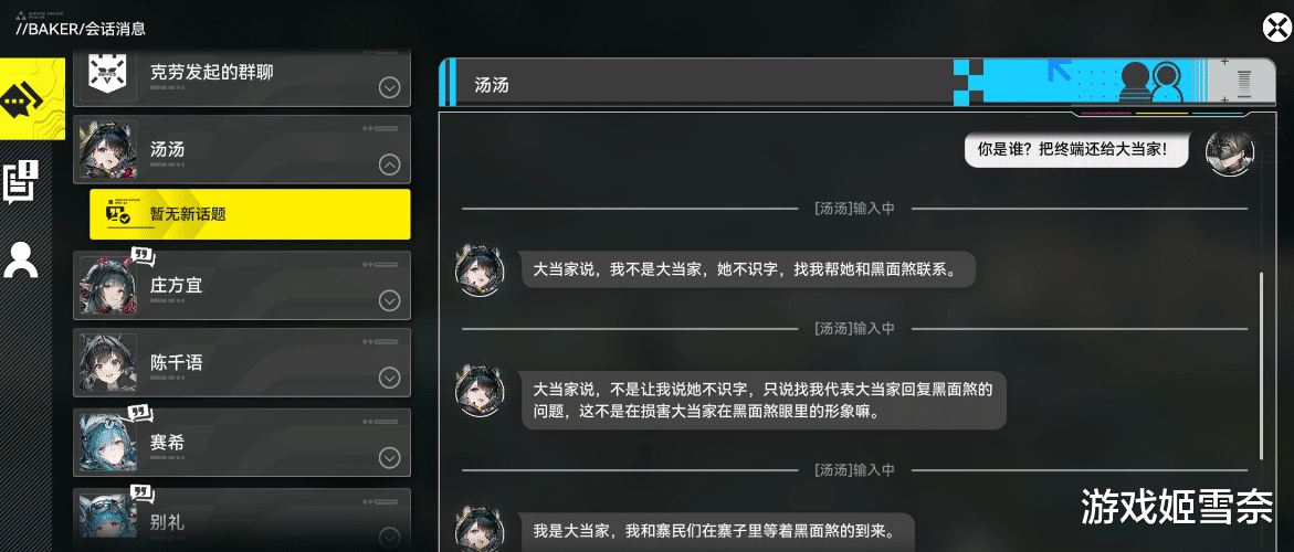 还有汤汤,人家傻龙其实还挺聪明的经常装傻,这汤汤是真傻,不认识字叫手下人发消息,一口一个大当家的不认字叫我帮忙跟管理员联系,第二句估计是被大当家揍了,一三人称混着说,都能想象到汤汤上蹿下跳对手下人急得跳脚的样子,这汤汤是神人,手下发信息的也是神人,真是给我看力竭了。
