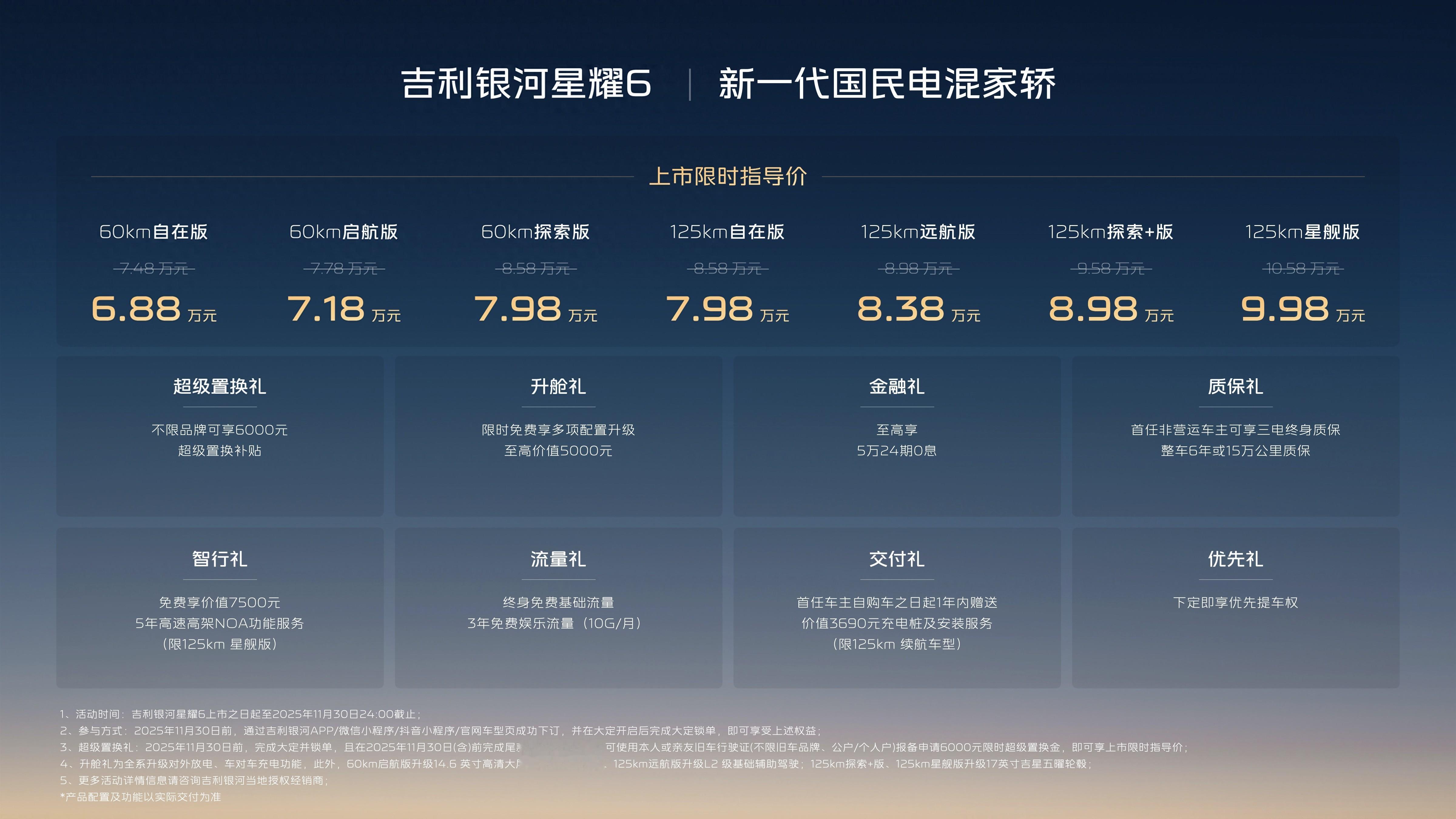 10 月 30 日,新一代国民电混家轿吉利银河星耀 6 迎来全球上市高光时刻!新车一口气推出 7 个版型,覆盖 60km 和 125km 两大续航梯队(含 60km 自在版、60km 启航版等),上市限时指导价仅 6.88 万 - 9.98 万元,性价比直接拉满。