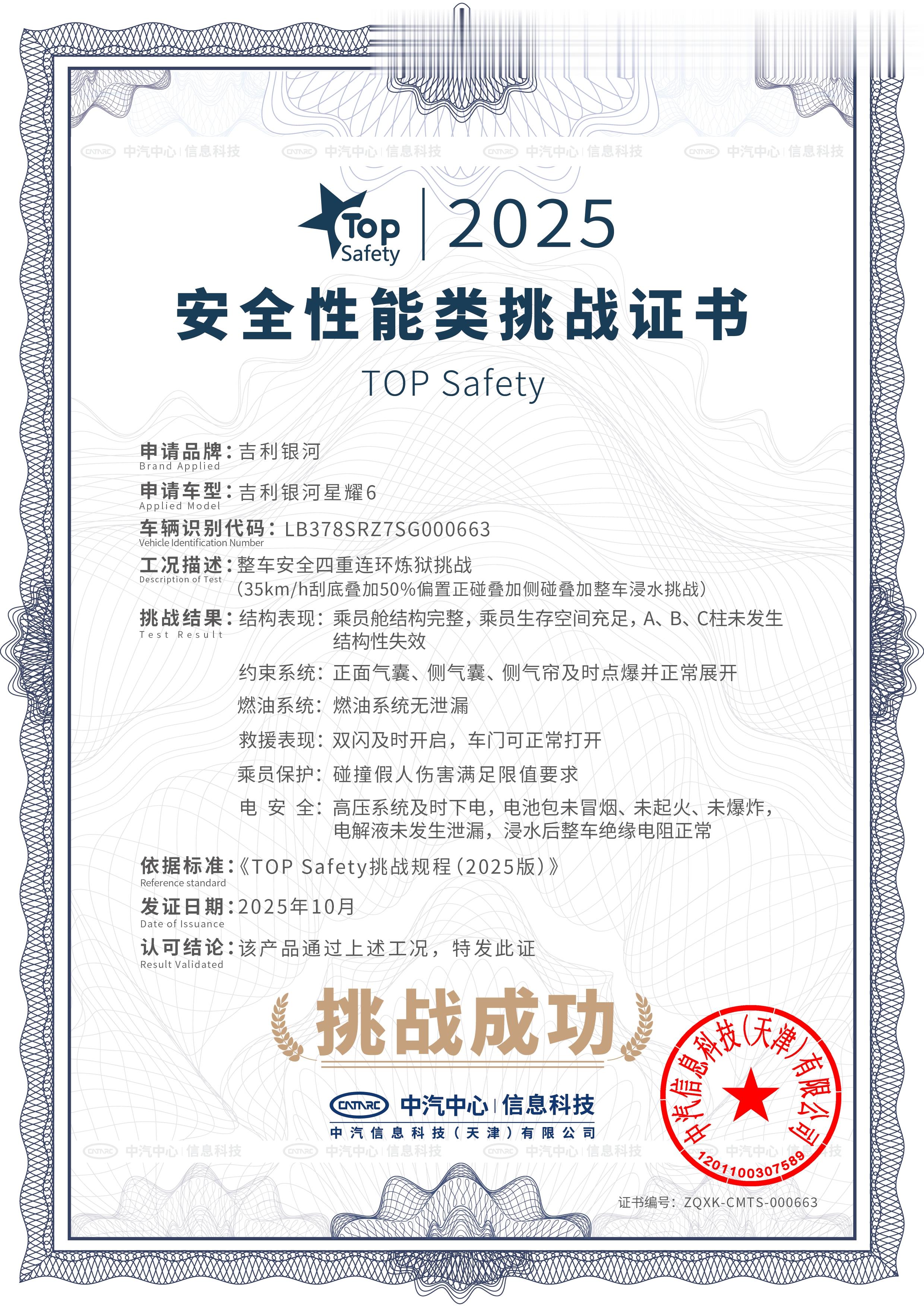 近期,吉利银河星耀6一次性通过中汽中心举办的行业首个超国标整车安全四重连环炼狱挑战,包括速度超现行标准16%的正面刮底碰撞、60km/h偏置正面碰撞、2.1倍国标能量的侧面碰撞及3倍国标深度的浸水测试,全面验证了从电池安全到车身结构稳定性的全维度安全实力,展现出在极端复合风险场景下的高安全冗余。