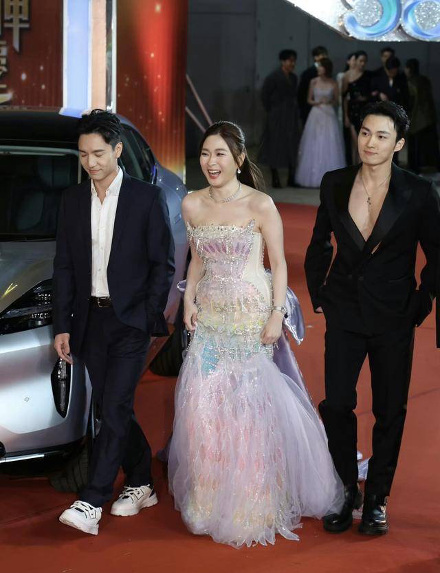 一班女艺人们在争奇斗艳的同时,个别男星也是非常抢镜,其中最引人注意的一定是力捧小生周嘉洛了,他当天穿着一身黑色的西装,最大的亮点当然是真空上阵,胸肌更是若隐若现,不仅让与其一同走红毯的女星感到惊艳,就连周嘉洛的好友朱敏瀚也是忍不住多看几眼。