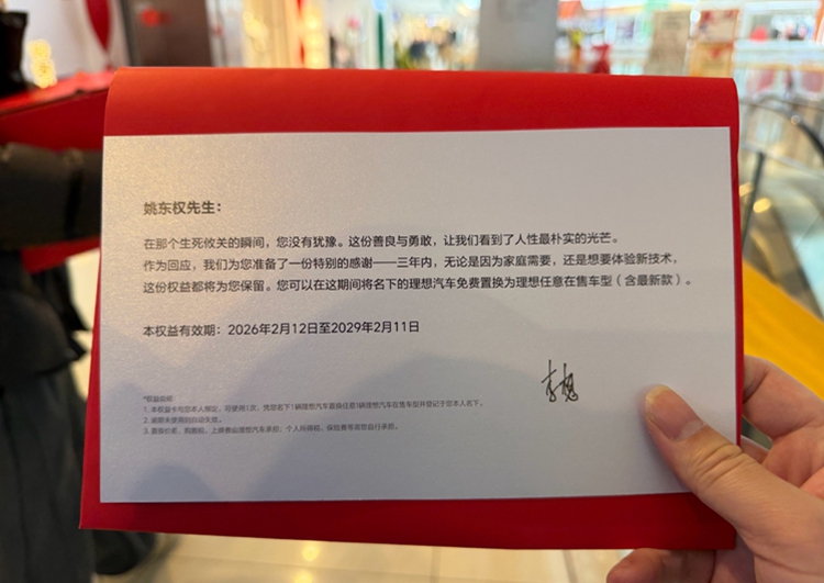 至于红信封里的东西是什么?参与了这场饭局的理想嘉兴车友会负责人在社交媒体上揭晓了答案:3年内可以将车主名下的理想汽车免费置换为理想的任意车型。无论是便宜的L6和i6,还是目前理想最贵的MEGA,亦或者是未来的新车,3年内车主想换就换。权益卡上还有李想的签名。