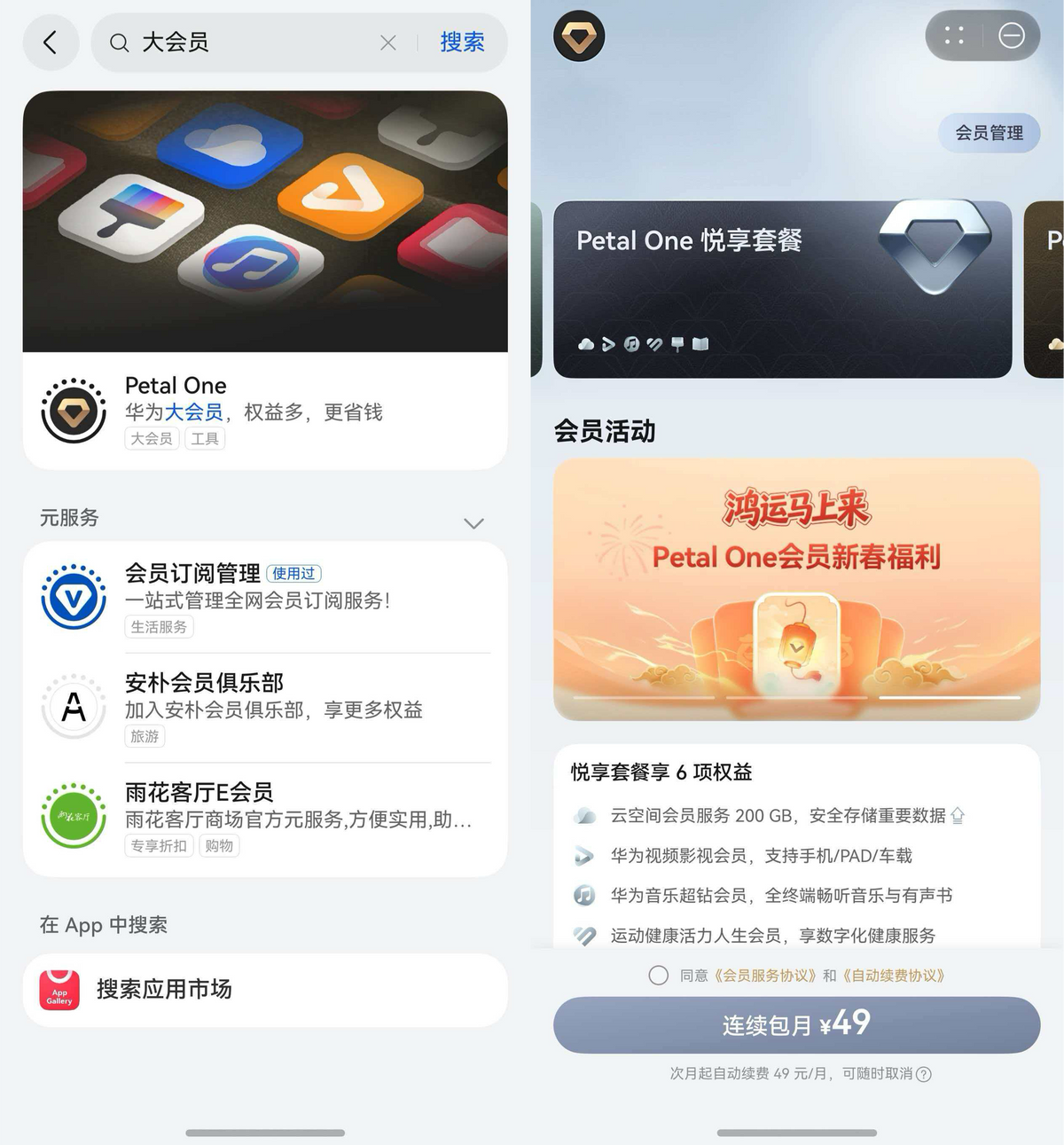 首先只要你的手机或平板是HarmonyOS 5.0及以上版本,直接前往桌面负一屏搜“Petal One”或者“大会员”就能看到活动入口。如果你还没订阅过Petal One会员,现在也正是合适的时候。例如我平时就有阅读的习惯,现在在活动页面订阅,还能再去领取一个月华为阅读会员;订阅畅享套餐,可领取主题会员;订阅悦享套餐可领取表盘会员;而订阅尊享套餐则可加购1元购买影视VIP年卡大礼包,包含12个月华为影视会员+12个月优酷小屏会员,绝对物超所值!