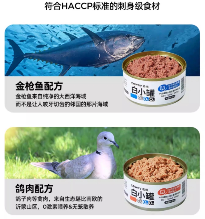 吃进嘴里的东西,绝对不能马虎。咱们选猫罐头必须要看原料,罐头的原料决定了它的品质好坏。希喂在这方面就很实在,是啥写啥。肉源直接选自沂蒙山区,是符合HACCP标准的人食级鲜肉,相当于我们在超市里买的可食用肉类,新鲜度和安全度就不用说了。配料表第一位明确标注“全鸽40%”,加入的鸡胸肉、鸡心、鸡肝等原料占比也是清晰可见。不像有的品牌就笼统写个“肉类及其制品”“禽类及其副产品”,谁知道里头·有没有掺肉粉、废弃边角料的,像猫咪这种能量和营养都离不开肉的,吃多了这种罐头必然会营养不良。除了原料实在,希喂还坚持0顾虑配方,0谷物、0胶质、0淀粉、0人工诱食剂,总之就是一切会对猫咪肠胃造成负担的都没有,像过敏体质和玻璃胃小猫也可以放心吃。