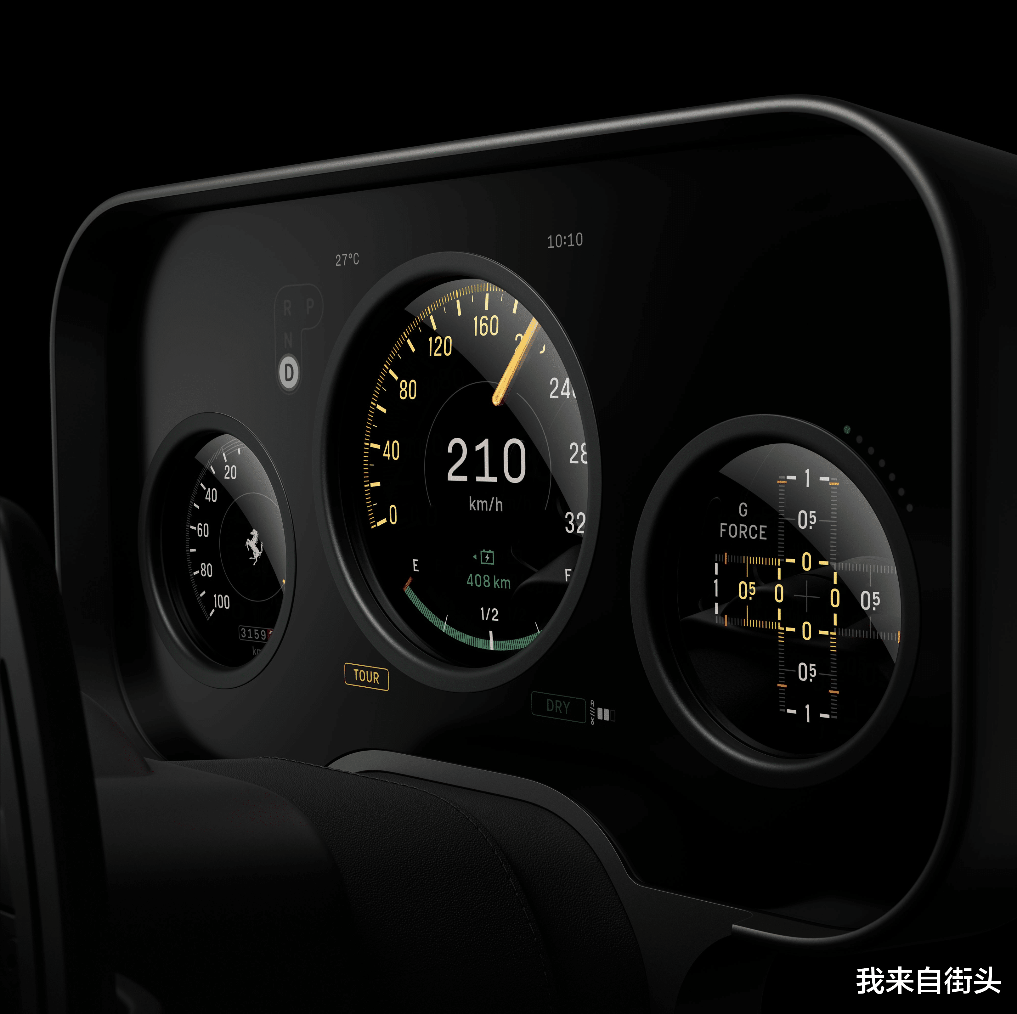 中控屏幕的操作面板通过球形关节安装,可自由调整朝向驾驶或副驾驶座,并设有掌托以提升操作稳定性。同时,中央显示器内还整合了多功能图表装置,采用三枚阳极氧化铝指针在玻璃保护的表盘上移动,可作为时钟、计时器、指南针或弹射起步系统显示。法拉利甚至为内饰开发了全新的专属字体,其设计灵感源自品牌历史字体与意大利工程标识风格。