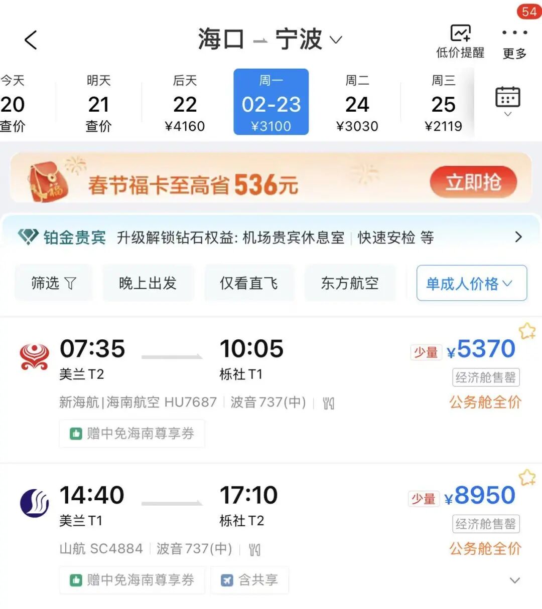 海口直飞宁波还有经济舱全价票