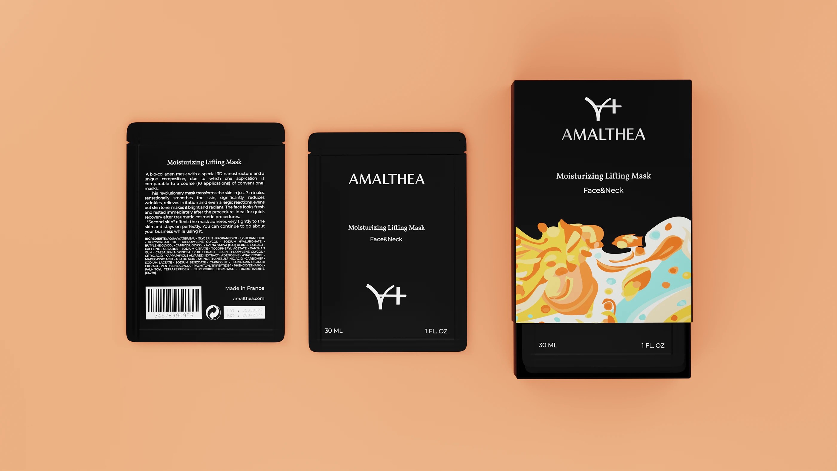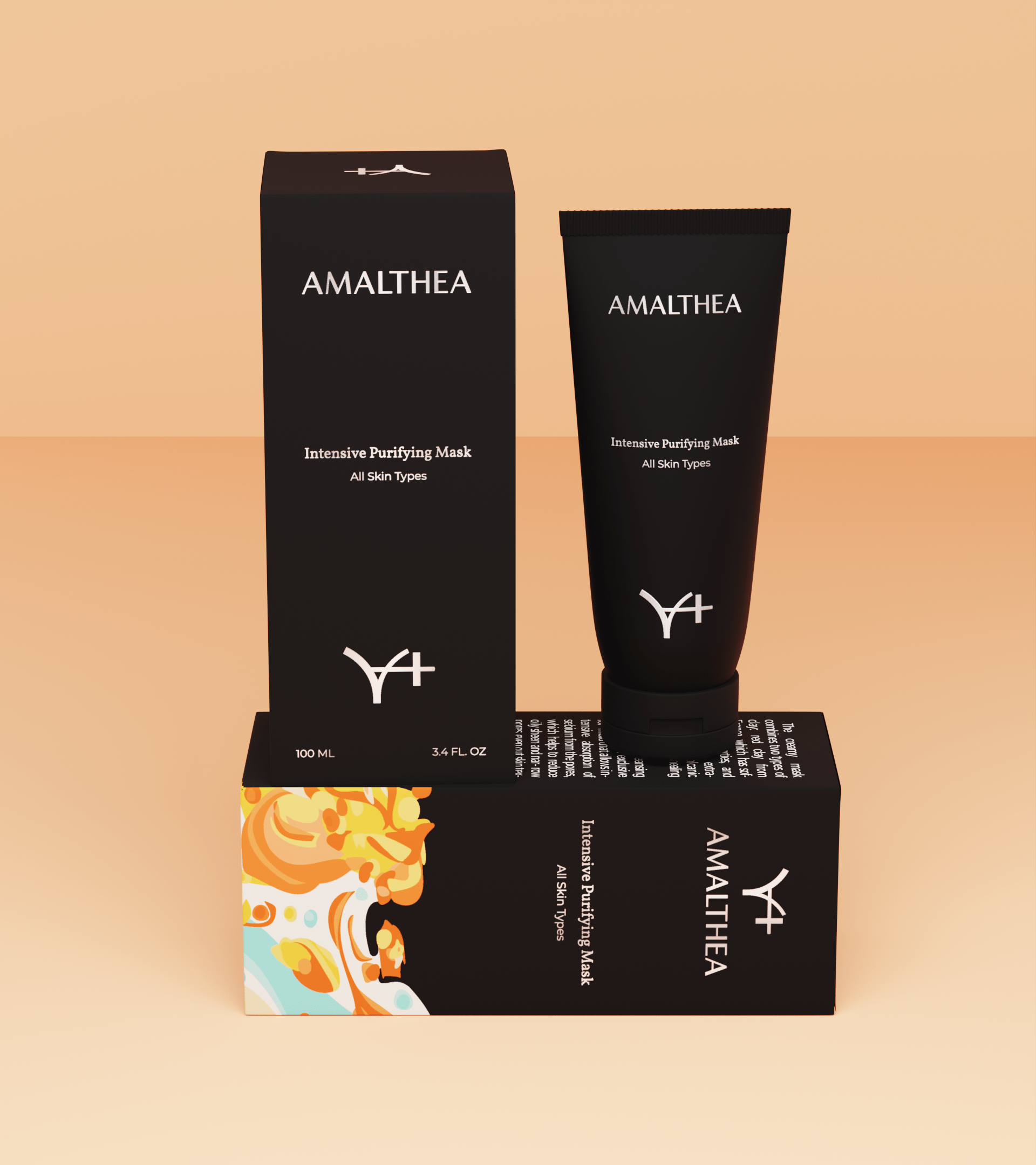 AMALTHEA的包装设计堪称时尚与艺术的完美结合。整体以黑色为主色调,营造出一种神秘而高端的氛围,仿佛在诉说着产品的独特与珍贵。简洁的字体搭配上品牌标志性的“Y+”符号,极具辨识度。而包装侧面或底部那色彩斑斓的抽象图案,犹如黑暗中的一抹亮色,瞬间打破了黑色的沉闷,为整个包装注入了活力与灵动之感。这种黑与彩的强烈对比,就像时尚界的经典搭配,既稳重又不失俏皮,让人过目难忘。无论是放在梳妆台上还是拿在手中,都像是一件精致的艺术品。