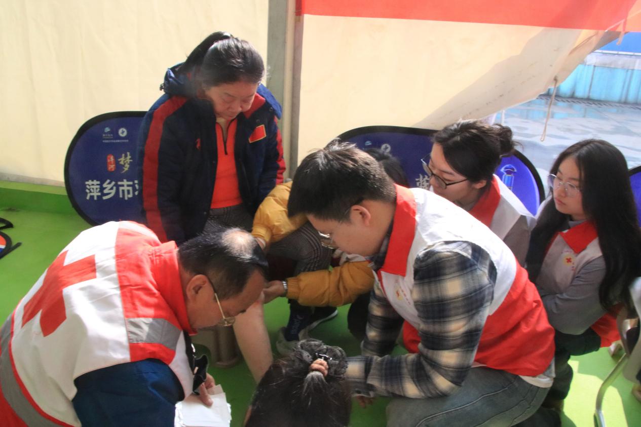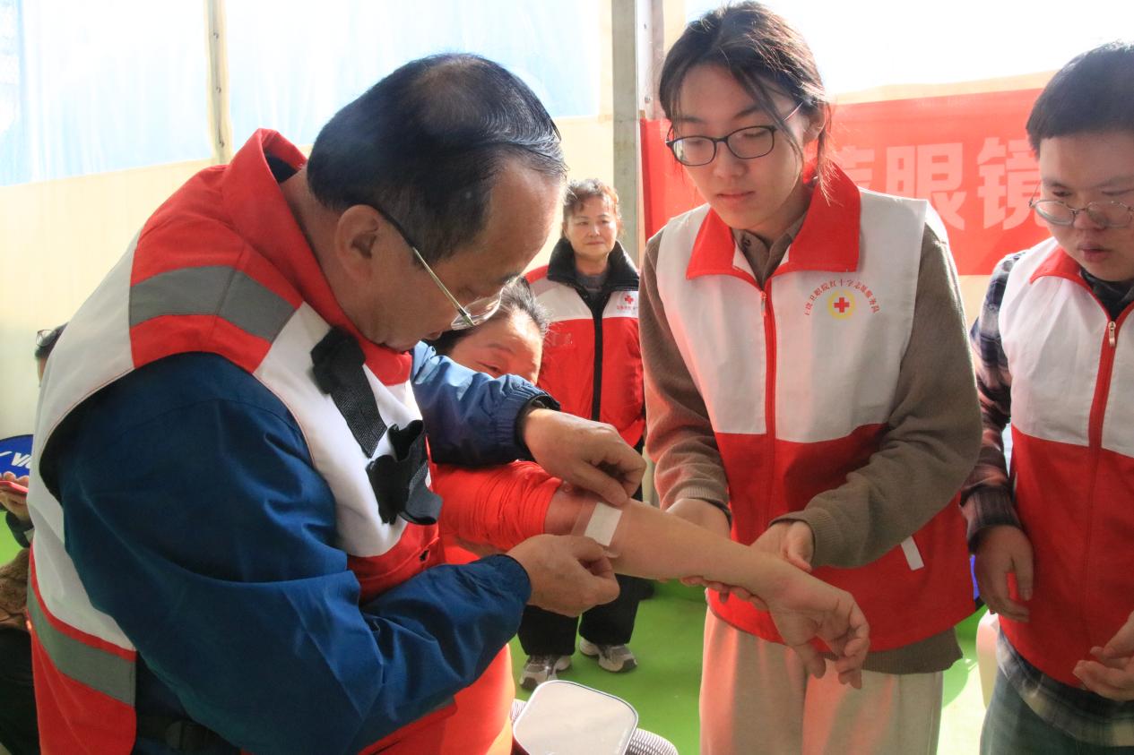 上饶卫生健康职业学院红十字志愿服务队与萍乡市红十字心理救援队共同承担现场应急救护任务。上饶卫职院红十字志愿服务队队员金悦,周凤婷,张雨晴在队长涂艳涵的带领下依托院校医学专业优势,携带急救箱、AED、止血包扎、消毒防护等设备,在赛场关键区域定点值守、动态巡查,快速处置多起运动损伤与突发不适,以规范操作与快速响应守护参赛人员安全。萍乡市红十字心理救援队在队长夏云剑的领导下同步融入应急保障,在提供心理疏导、情绪安抚的同时,协助开展现场救护、秩序维护与人员引导,实现“身体急救+心理支持”双护航。