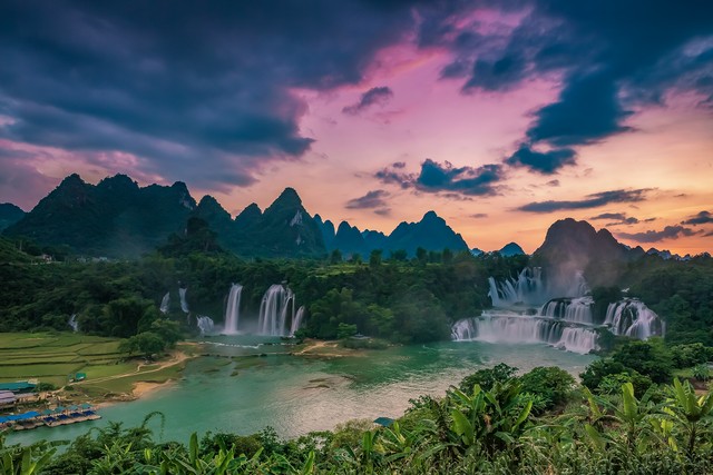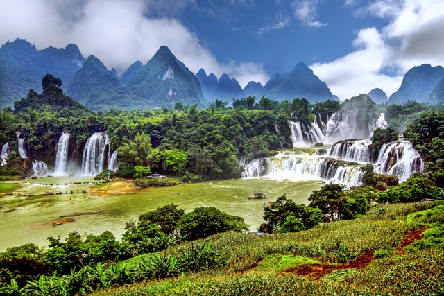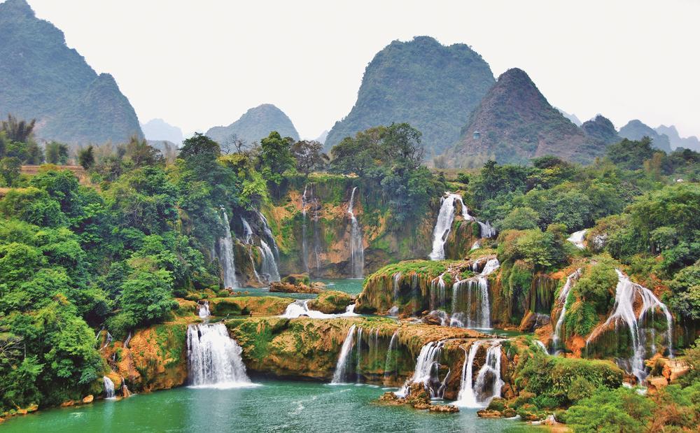 而它独特的边境风情更是为其增色不少。德天瀑布与越南的板约瀑布仅有一河之隔,站在这边,便能清晰地看到对岸的越南小船在河面上轻轻摇曳,还有那独具东南亚风情的建筑,错落有致地分布在对岸,别具一番风味。运气好的时候,甚至能看到越南当地居民的日常活动,这种跨国界的视觉体验,实在是奇妙无比。