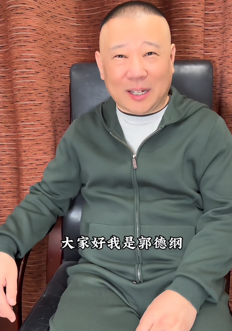 他坐在一把椅子上,身穿一套军绿色运动服,内穿灰色长袖,还是熟悉的桃心发型,看着保养的还挺好的。
