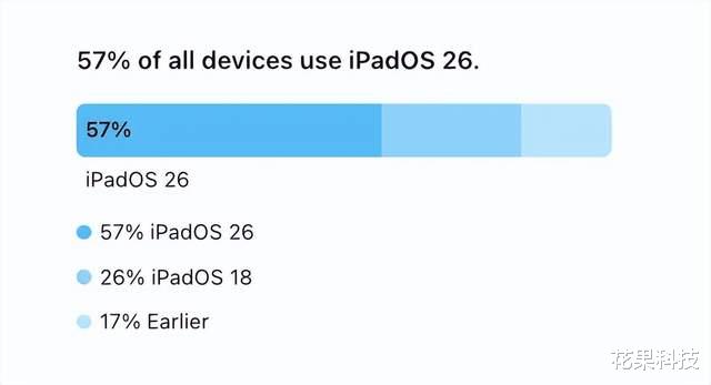 还有 26% 的 iPad 在运行 iPadOS 18,甚至还有 17% 的 iPad 还在运行更早的系统版本。