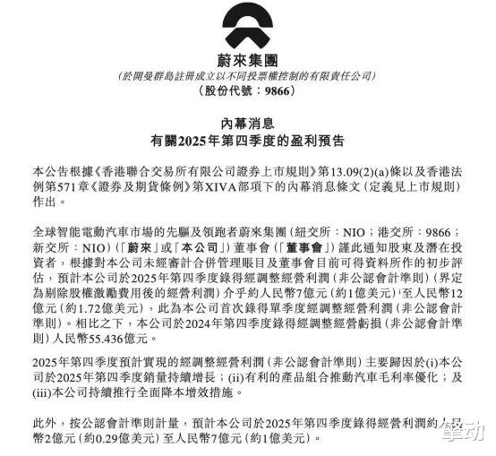 近日,蔚来发布2025年第四季度盈利预告,预计录得经调整经营利润(非公认会计准则)7亿元至12亿元。这意味着这家自成立起便与亏损标签绑在一起的车企终于实现了单季盈利。
