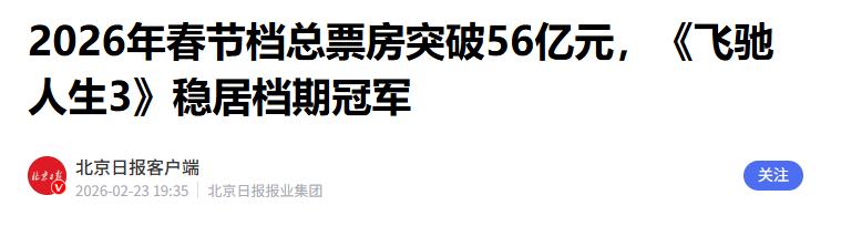 北京日报客户端 2026-02-23——2026年春节档总票房突破56亿元,《飞驰人生3》稳居档期冠军