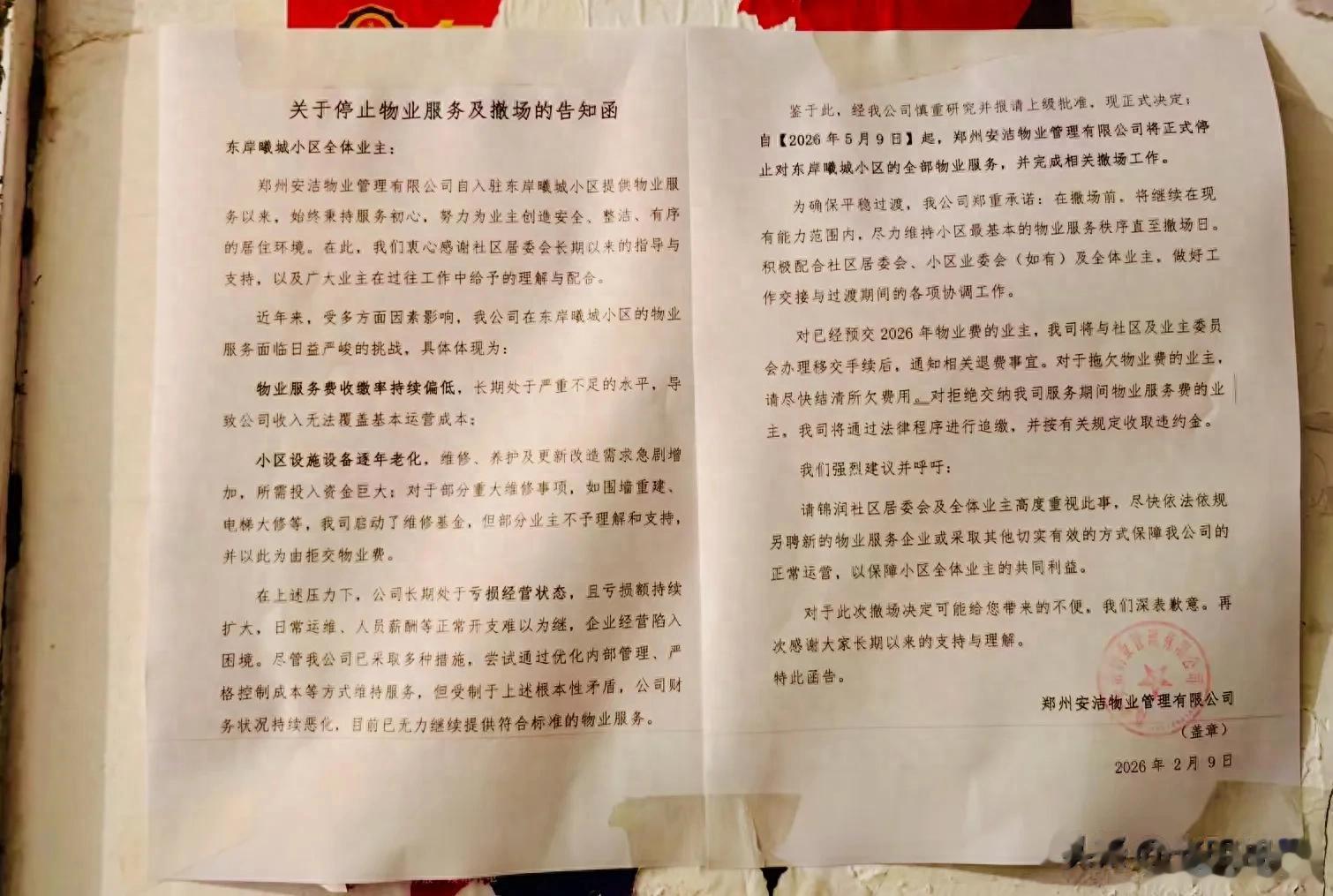近日,郑州安洁物业管理有限公司向东岸曦城小区全体业主发出告知函,表示因长期面临经营困难,计划于2026年5月9日起停止物业服务并撤出该小区。此事引发社区广泛关注,如何妥善做好后续衔接、保障居民正常生活秩序,成为当前关键。