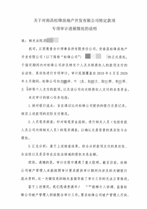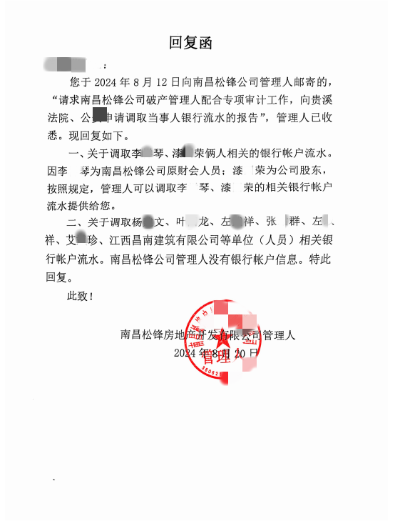 债权人反映,在南昌松锋破产重整案件中,由北京市京师(南昌)律师事务单位、江西中审会计师事务单位担任的破产管理人,存在多项履职不当、审核不规范的问题。
