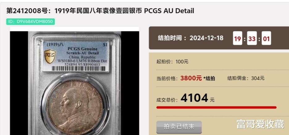 在2024年12月18日的“现代钱币拍卖会”中,一枚PCGS评级AU Detail,1919年(民国八年)的“袁像壹圆银币”,最后拍出了4104元。