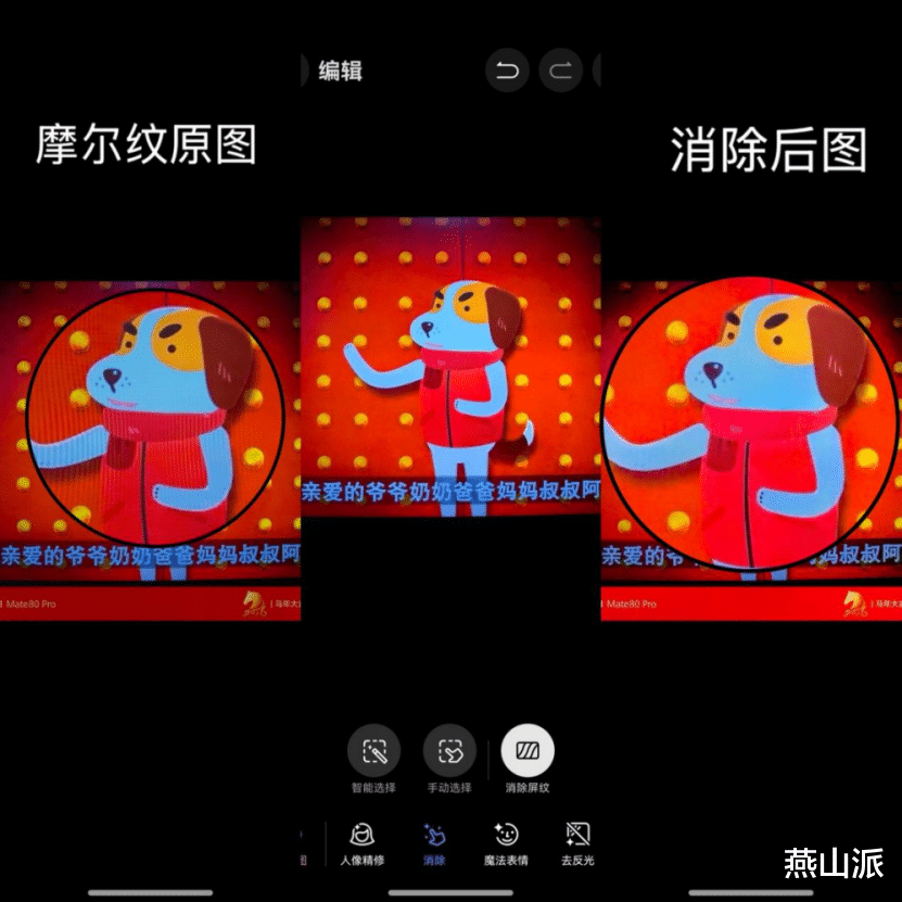 针对春节期间常见的“翻拍屏幕分享”场景,华为Mate 80系列的AI修图功能可一键消除恼人的屏幕摩尔纹,让画面恢复清晰干净。搭配马年限定主题水印,更能为照片增添专属的节日气息,轻松拍出既有内容、又有氛围的春节大片。