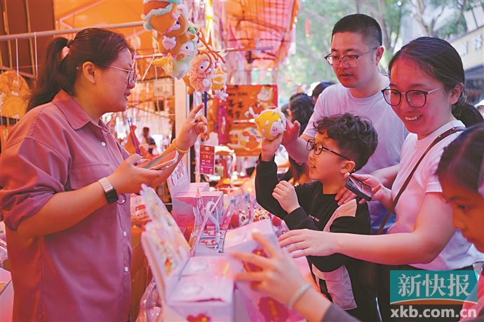 西湖路的越秀区花市上,6只大湾鸡携手亮相开市仪式,引得众多市民和游客驻足拍照。市民张先生手里提着两盆蝴蝶兰,另一只手则护着刚买到的“喜洋洋”公仔,他笑着对记者表示,自己是专门来找“白切鸡”的。“我们老广都说‘无鸡不成宴’嘛,去年全运会的时候,有朋友送了我女儿一个‘乐融融’,她就想着过年的时候能凑成一对,所以我在花市上就把‘喜洋洋’也买回来了。”