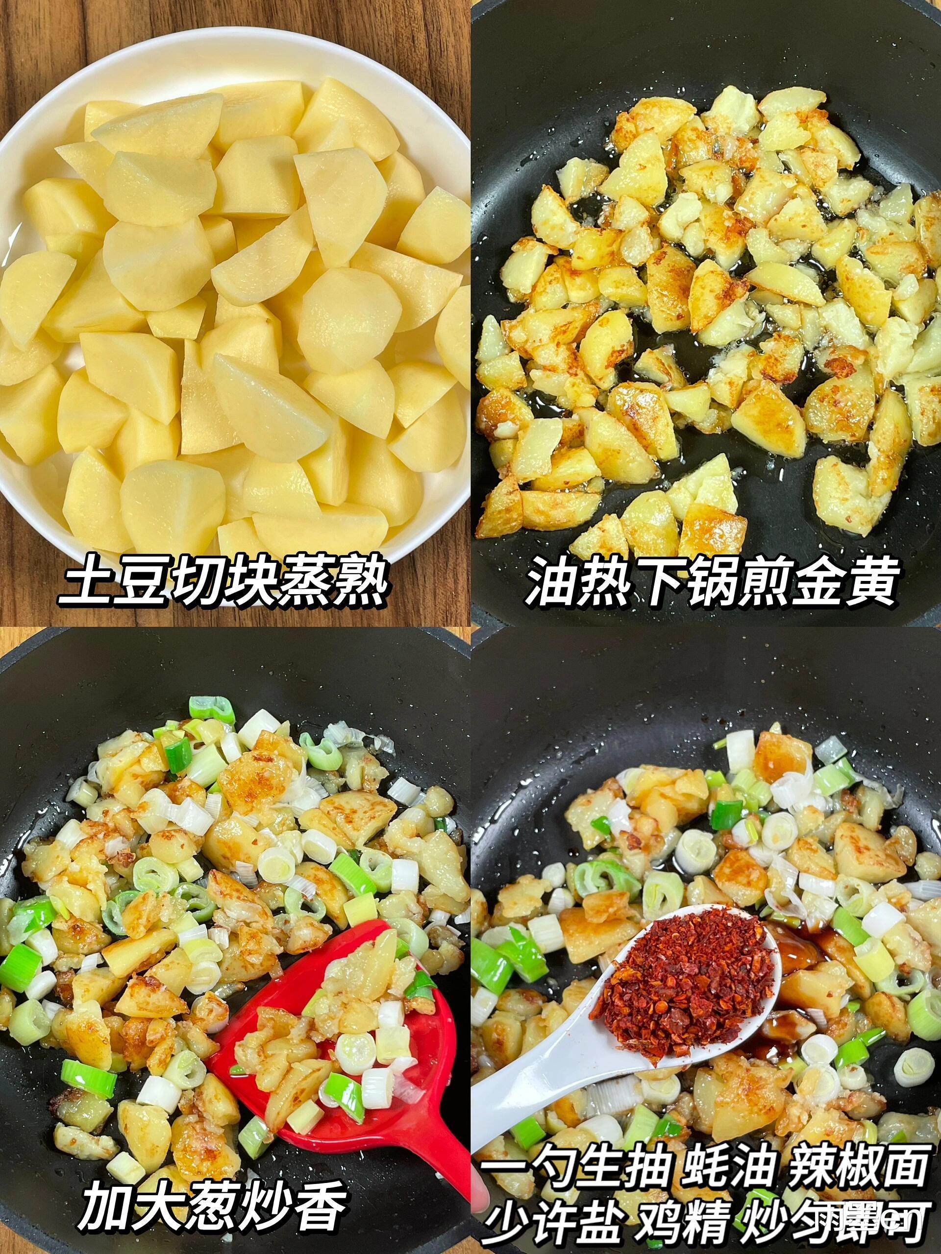 制作步骤分3步,25分钟就能上桌!第一步处理土豆:土豆洗净去皮,切成滚刀块(大小均匀,容易煮熟),放入锅中加清水没过土豆,大火煮开后转中火煮10分钟,直到用筷子能轻松戳透(别煮太烂,不然炒的时候会碎)。捞出土豆沥干水分,用勺子轻轻压成半碎状(不用压成泥,保留颗粒感更有口感)。第二步爆香调料:小葱切成葱花(留一半最后撒),大蒜切末,小米辣切圈备用。热锅冷油,油烧至六成热(手放锅上方能感觉到热气),放入蒜末和小米辣爆香,香味飘出来后转小火。第三步炒至焦香:倒入压好的土豆块,用锅铲轻轻翻炒2分钟,让每块土豆都裹上油脂。接着加入盐、生抽、蚝油,转中火继续翻炒3分钟,直到土豆表面出现焦黄色的脆边(这步是灵魂!焦香全靠它),最后撒上剩余的葱花,翻炒均匀就能出锅!