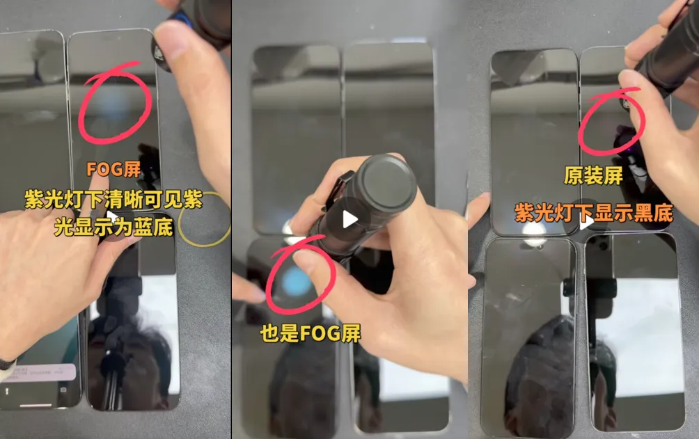 至于拆机鉴别,最靠谱但普通人别乱试——原装屏支架淡黄、排线规整,摄像头孔封胶清晰;FOG屏支架偏白、带编码,封胶工艺拉胯,专业人士一看就懂。重点划重点:FOG屏一直在升级,现在几乎能乱真,单靠一个方法没用,得综合判断。