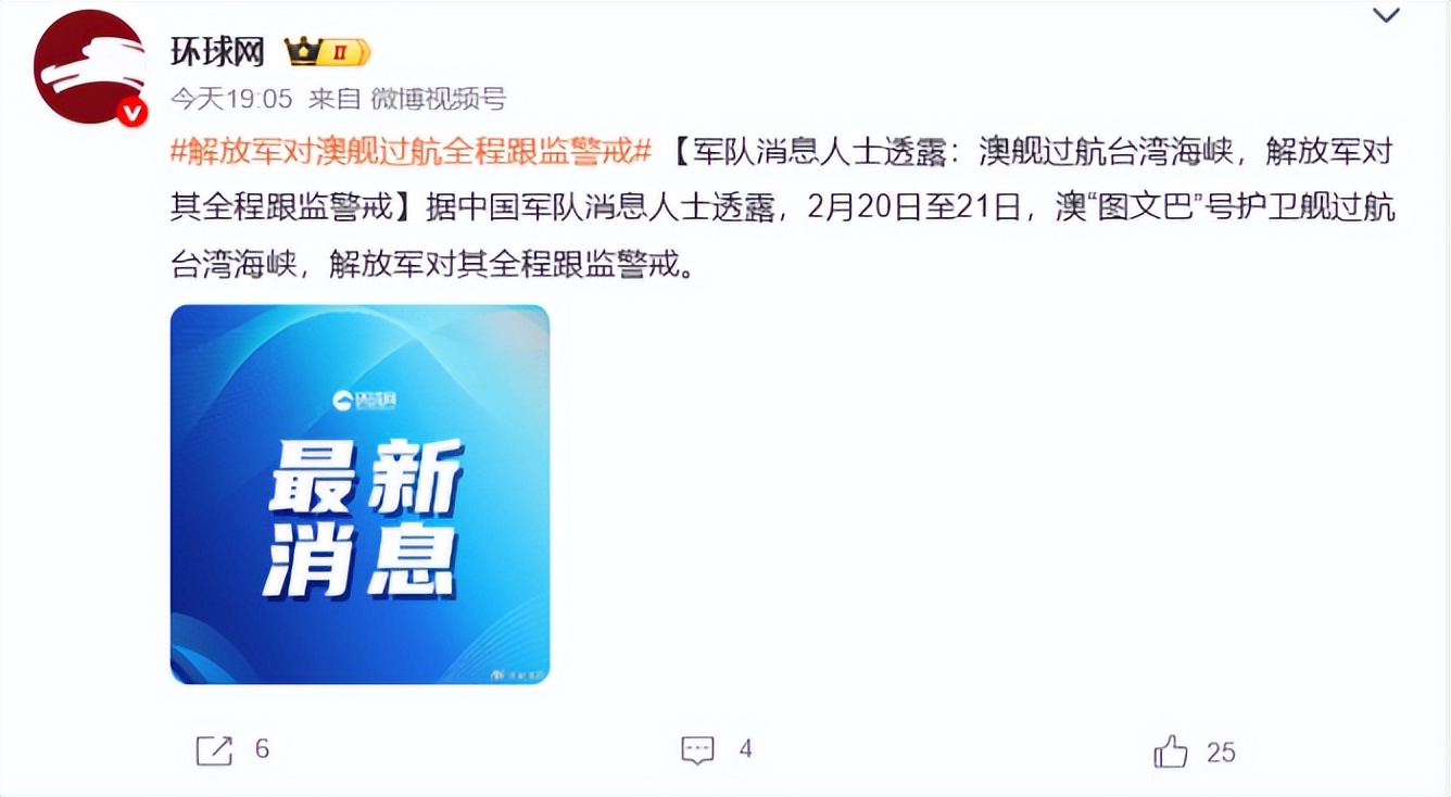2 月 20 号,澳大利亚海军一艘叫 “图文巴” 号的护卫舰,刚参加完美国、菲律宾、澳大利亚三国的海上巡逻演习,就从南往北窜进台湾海峡。这艘舰不是正常过路,而是故意搞挑衅动作。到中午 11 点 10 分左右,它航行到澎湖列岛西北大约 120 海里的地方,故意调整航向,往福建领海和毗连区靠近,明显是想试探我们的底线,制造紧张局势。