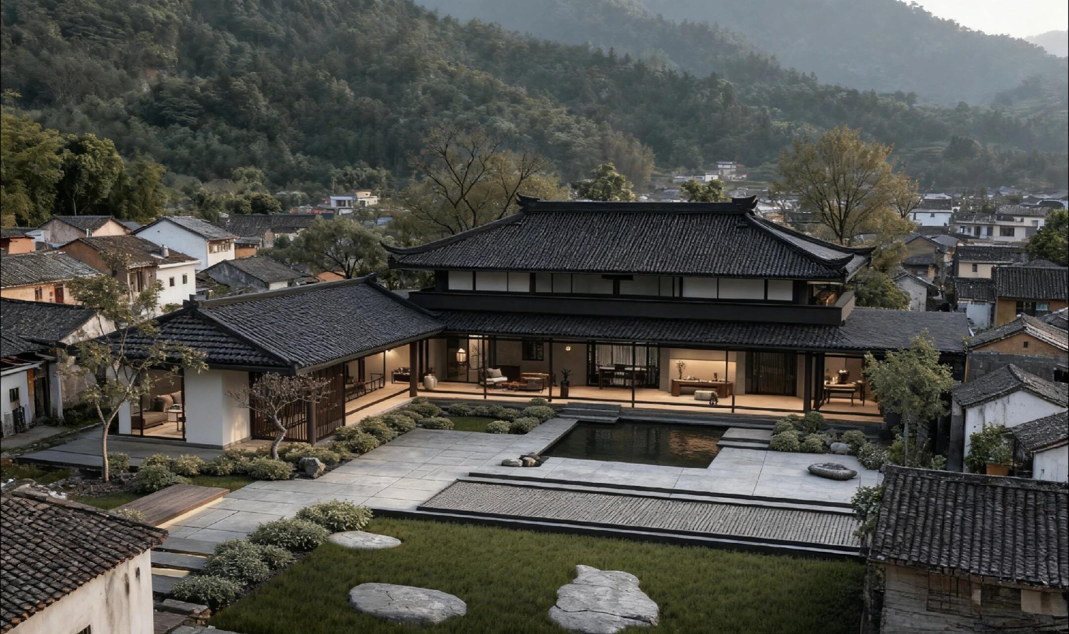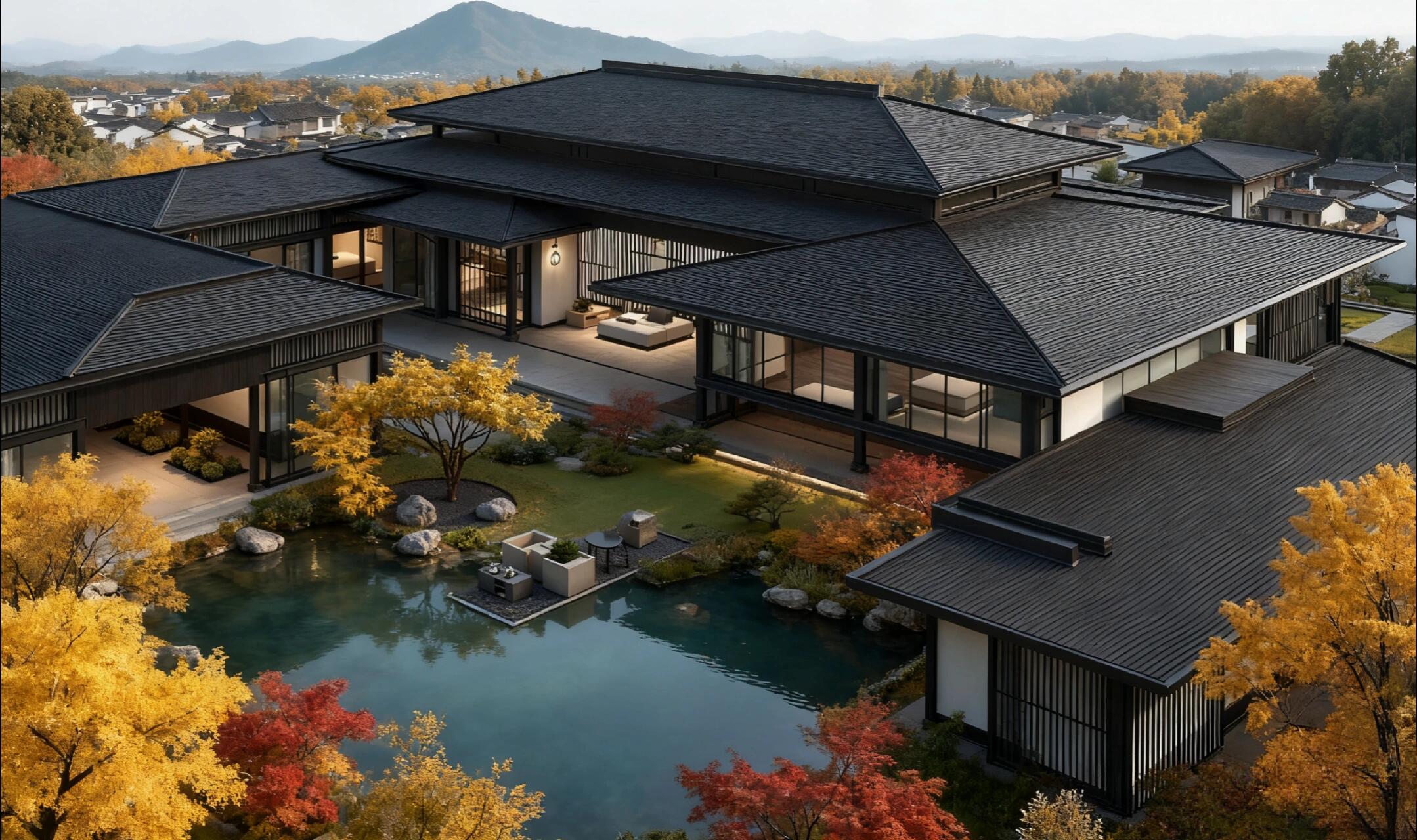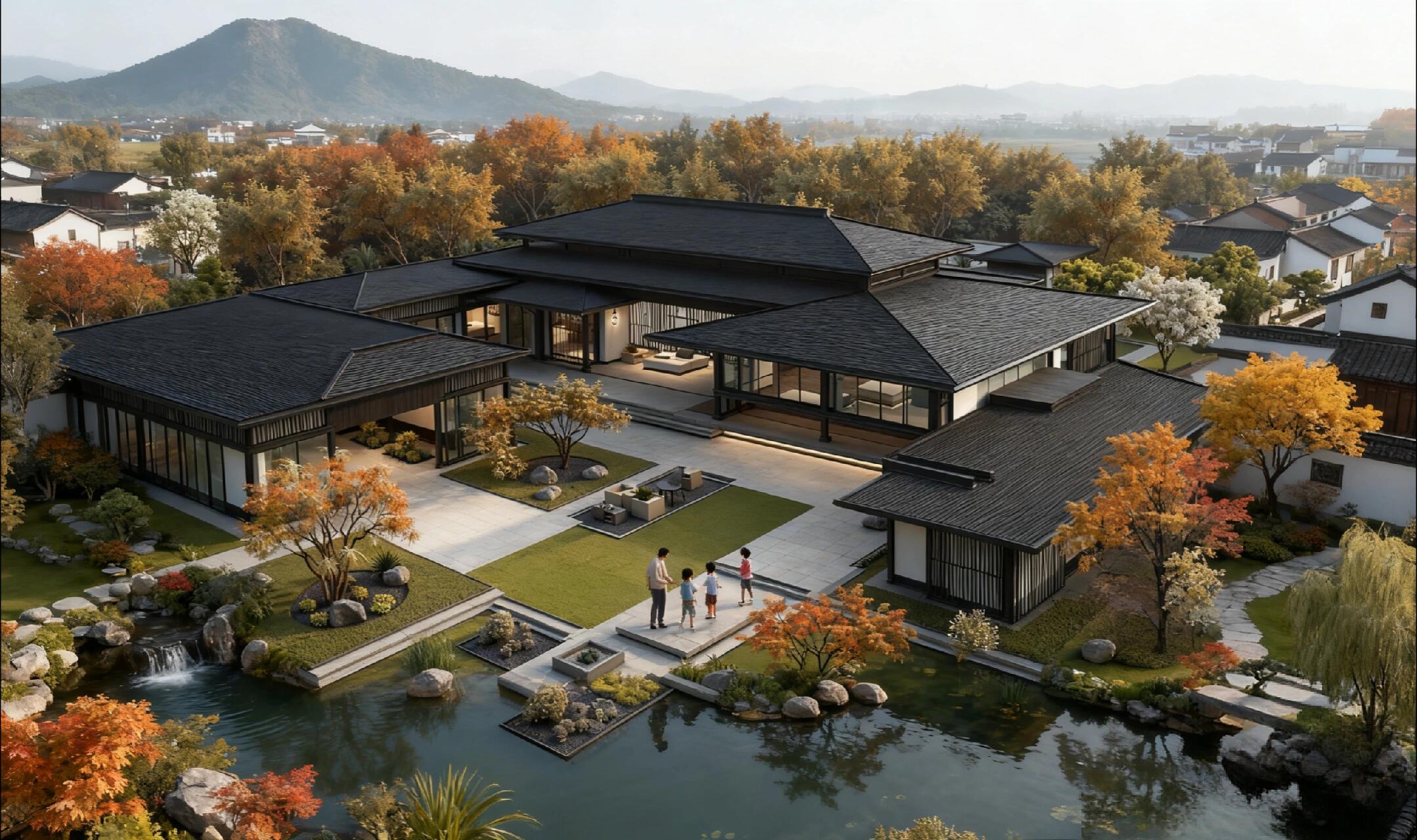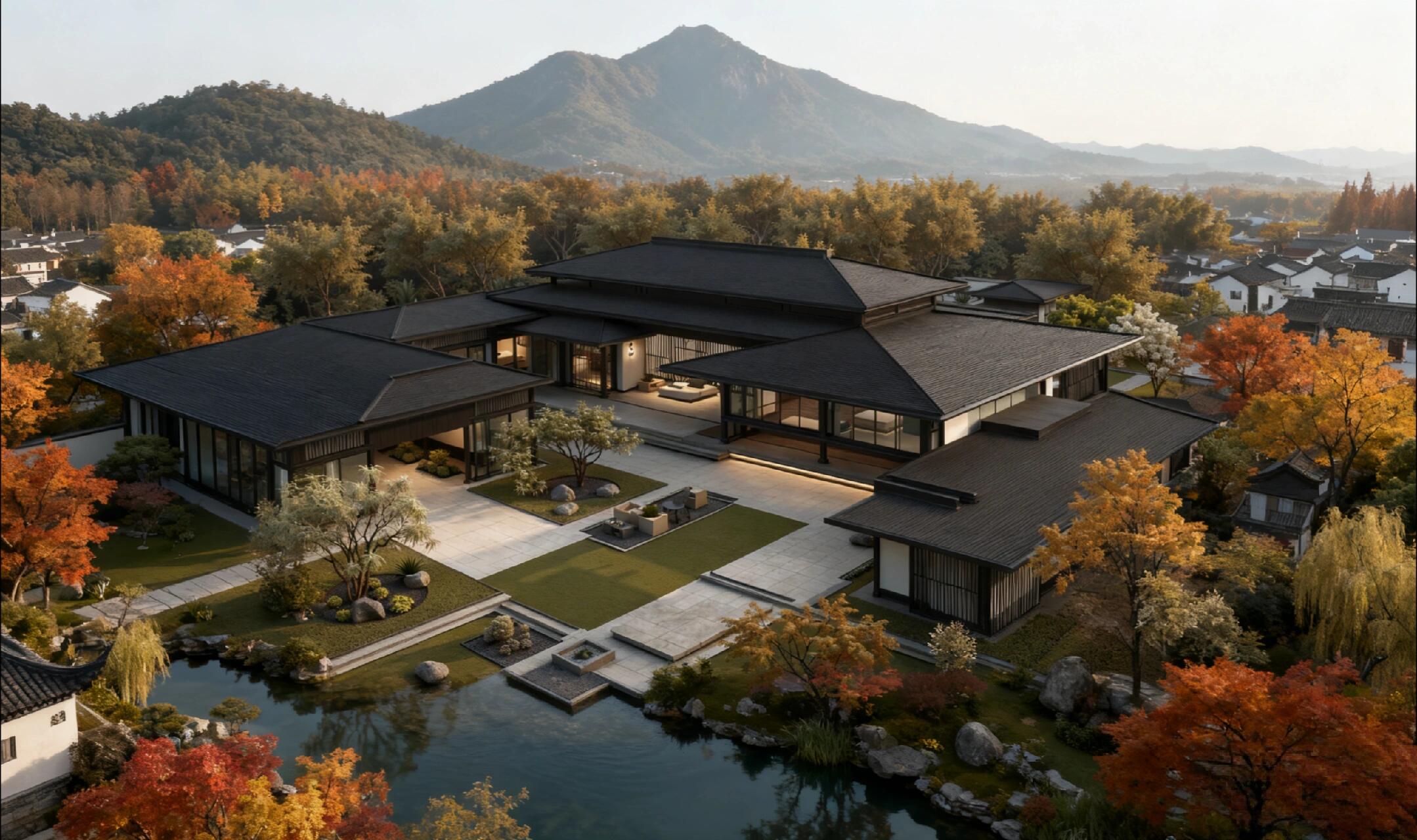 当黑瓦飞檐轻轻落在玻璃幕墙的轮廓之上,当枯山水的留白晕染进江南的秋林,宋式美学的魂魄,正以新中式建筑的形态,在当代山水间悄然生长。