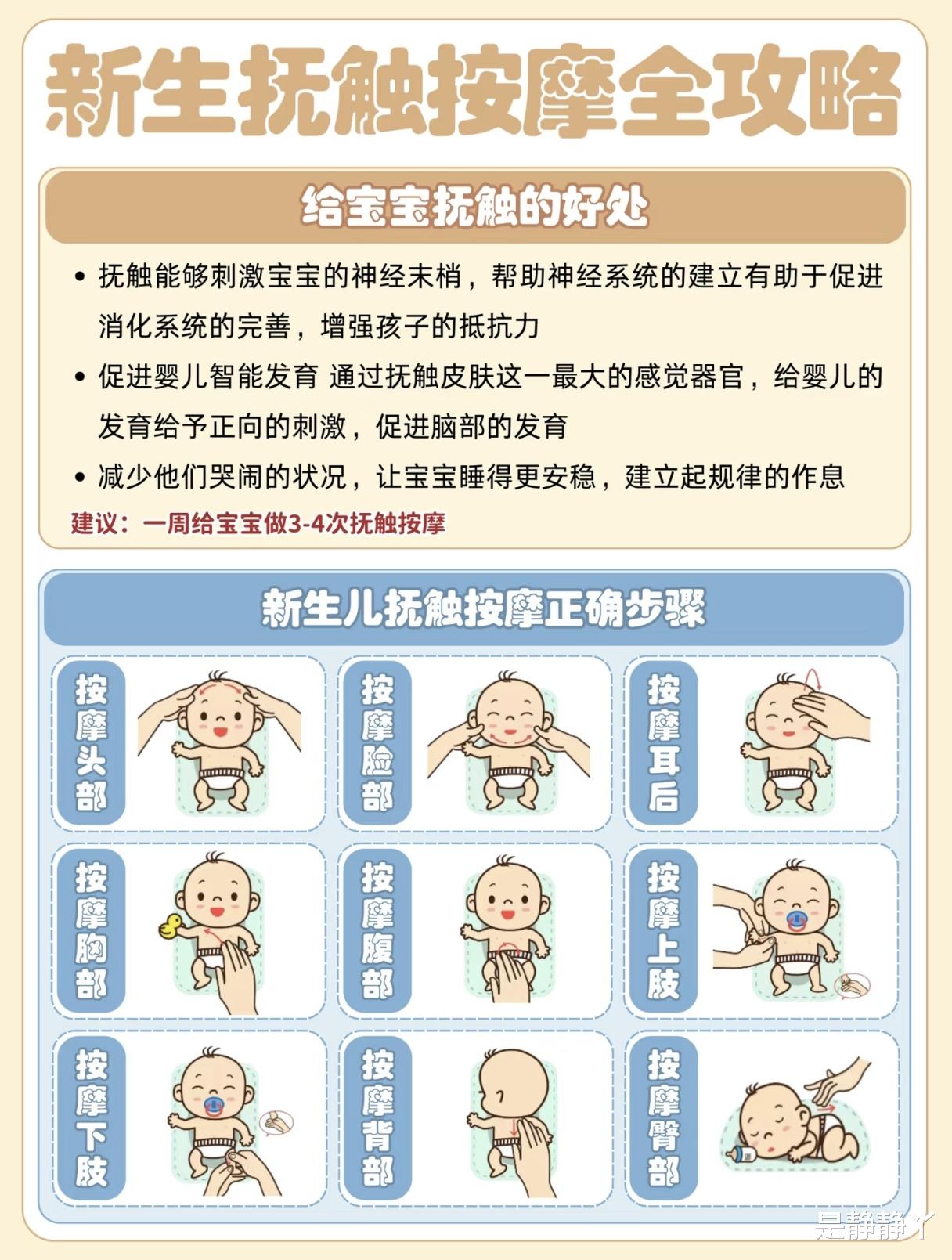 除了基础的吃喝拉撒,每天抽出一点时间给宝宝做抚触,是促进他身心发育的“秘密武器”。抚触不仅仅是简单的摸摸肚子,它是通过皮肤这一最大的感觉器官,向宝宝的大脑传递爱的信号。温柔的按摩能刺激宝宝的神经系统,促进智力发育;顺时针抚摸腹部能帮助肠道蠕动,缓解胀气和肠绞痛,让宝宝吃得更香、排便更顺畅;轻柔的背部按摩则能让宝宝肌肉放松,情绪稳定,减少哭闹,从而拥有更安稳的睡眠。更重要的是,在抚触的过程中,你的眼神、声音和体温,能让宝宝获得满满的安全感,这是建立亲密亲子关系的最佳桥梁。