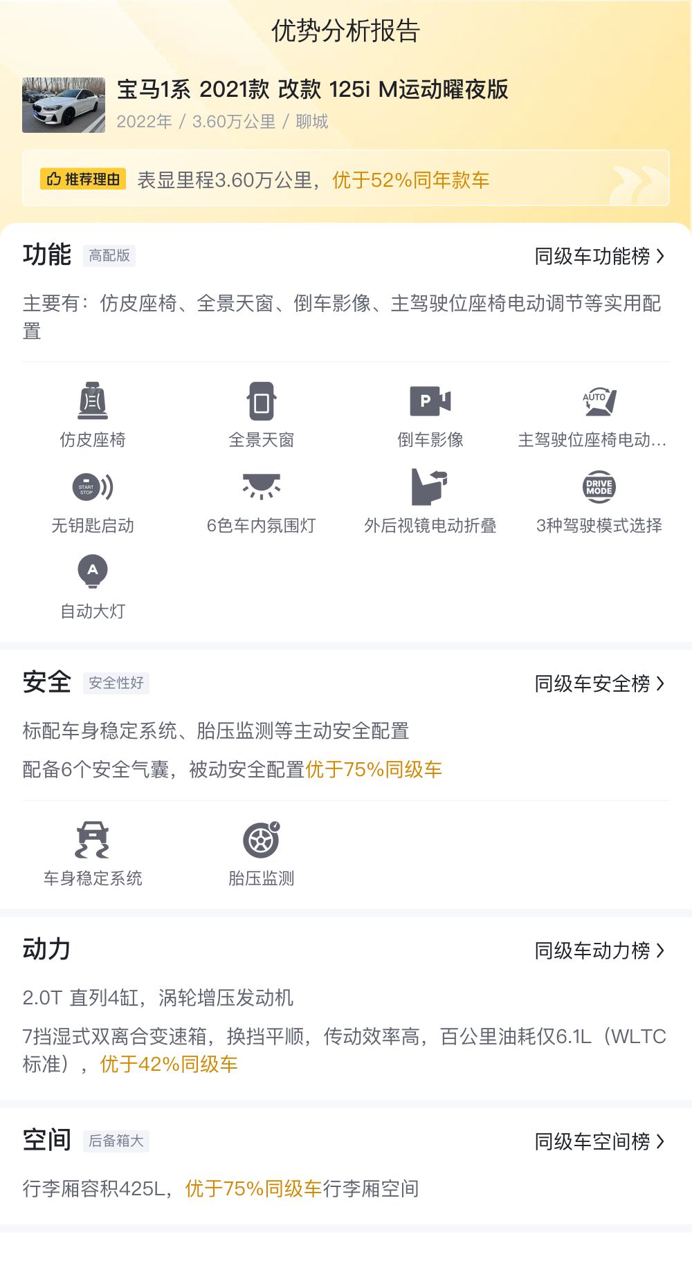在用车成本方面,根据懂车帝的大数据分析,宝马1系2021款改款125i M运动曜夜版的10年平均用车成本约为12,345元/年,这一数字在同级别车型中属于合理范围,能够满足大多数消费者的预算需求。