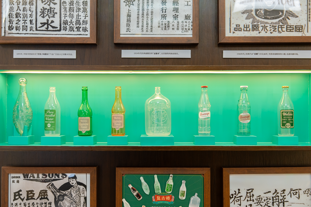 在大健康药柜旁边,陈列着关于「苏打水」的记忆。在这里,我们能够看到自1876年以来屈臣氏苏打水包装的变迁,更能试饮百年前的同款风味。