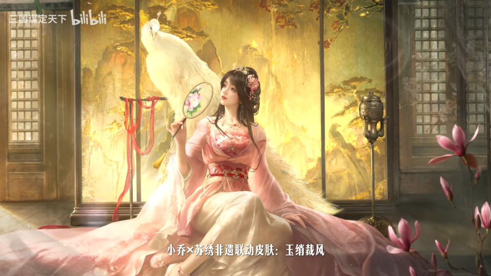 答案藏在《三国:谋定天下》里。这款以三国为背景的策略手游,最近和苏绣非遗传承人姚老师合作推出了“二乔南屏”主题皮肤。姚老师出身刺绣世家,她的“简针绣”曾让苏绣登上威尼斯双年展,而这次用的“双面双异绣”更是被大英博物馆收录的绝技——同一块绣布,正面是清雅如月的白牡丹,反面是灵动热烈的粉芍药,大乔小乔手中的团扇,就藏着这样的巧思。当玩家滑动屏幕切换视角,扇面两面的绣纹缓缓流转,仿佛能看见绣娘飞针走线的身影,也能听见三国故事里姐妹花的轻笑。