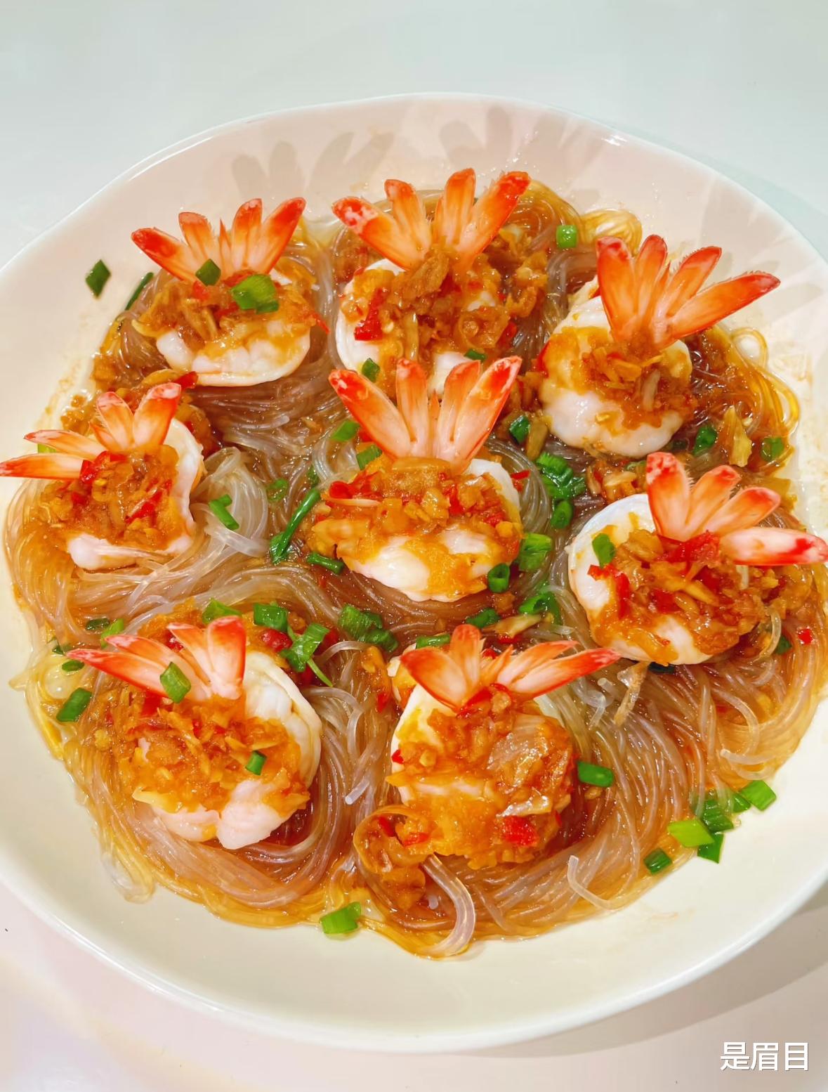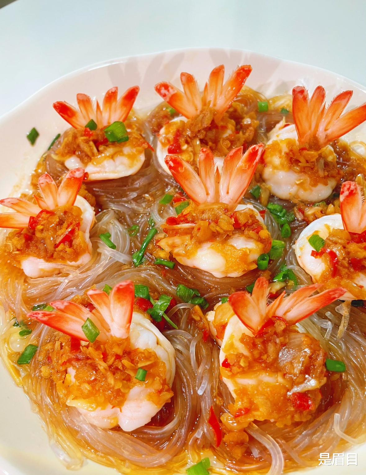 1.这是这道菜成败的关键,目的是让虾蒸熟后像花朵一样绽放,而不是缩成一团。剪掉虾须和虾脚,用剪刀从虾背剪开(深度约2/3,不要剪断),挑出虾线。用刀背在虾肉上轻轻拍几下,破坏虾筋,这样蒸的时候虾肉就不会收缩卷曲。将虾尾从剪开的背部穿过去,形成一个“蝴蝶结”或“花朵”的形状。这一步能让虾身立起来,造型更立体。2. 粉丝用温水泡软(约15-20分钟),捞出剪成小段。在泡软的粉丝中加入1勺生抽和少许油拌匀,这样蒸出来的粉丝根根分明,不会粘成一坨。3. 这是这道菜香味的来源,生蒜和熟蒜的结合能带来丰富的层次感。大蒜剁成蒜末,分成两份。其中一份用清水冲洗一下并沥干(可以防止炸的时候发苦)。锅中倒油烧热,转小火,放入洗过的蒜末,炸至金黄色后关火。立即倒入另一份生蒜末,利用余温炒匀。加入生抽、蚝油、白糖、盐,搅拌均匀,蒜蓉酱就做好了。4. 将拌好的粉丝铺在盘底,把处理好的虾整齐地摆放在粉丝上,虾头朝外,围成一圈。将蒜蓉酱均匀地铺在每一只虾的背上。锅中水烧开后,放入盘子,大火蒸5-8分钟。时间不宜过长,否则虾肉会变老。5. 蒸好后取出,撒上葱花和小米辣圈。 烧一勺热油,“刺啦”一声淋在葱花上,瞬间激发出香味。最后淋上一圈蒸鱼豉油提鲜即可。