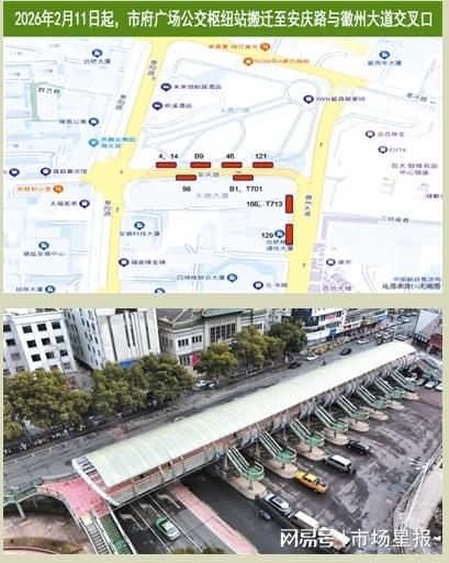 2026年2月9日,合肥公交集团正式发布公告:自2月11日起,服役近18年的市府广场公交枢纽站整体搬迁,同步调整4路、14路、46路、98路、117路、121路、129路、166路、B1路、B9路、T701路、T713路共12条公交线路走向与停靠站点。这不仅是合肥公交网络优化的关键一步,更标志着淮河路步行街西延、市府广场改造两大“十五五”重点工程进入实质施工阶段,合肥老城核心区更新迎来历史性节点。