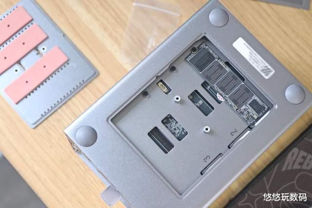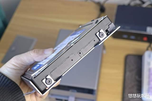 针对机械硬盘的痛点,零刻做了针对性优化:硬盘架与机身采用内六角螺丝紧配固定,搭配双面减震硅胶塞,有效降低振动噪音和磁盘坏道风险;硬盘架同样为铝合金材质,通过导热硅胶与硬盘接触。