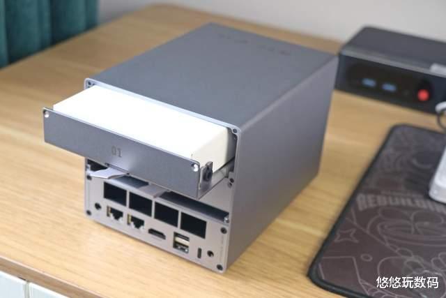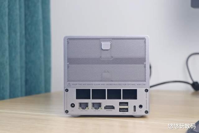 后背面板使用了可拆卸磁吸式散热网罩,内部还巧妙将电源适配器、HDMI线、六类网线、螺丝包等收纳了到了SATA硬盘仓中。还有较丰富的接口:包括1个USB 3.2接口(10Gbps,支持视频输出)、2个USB 2.0接口、HDMI 2.1接口(支持4K 60Hz输出)、5Gbps+2.5Gbps双网口、3.5mm音频插孔。双网口设计是一大亮点,支持链路聚合为7.5Gbps,连接万兆交换机时可跑满5Gbps速率,大幅提升大文件传输效率。