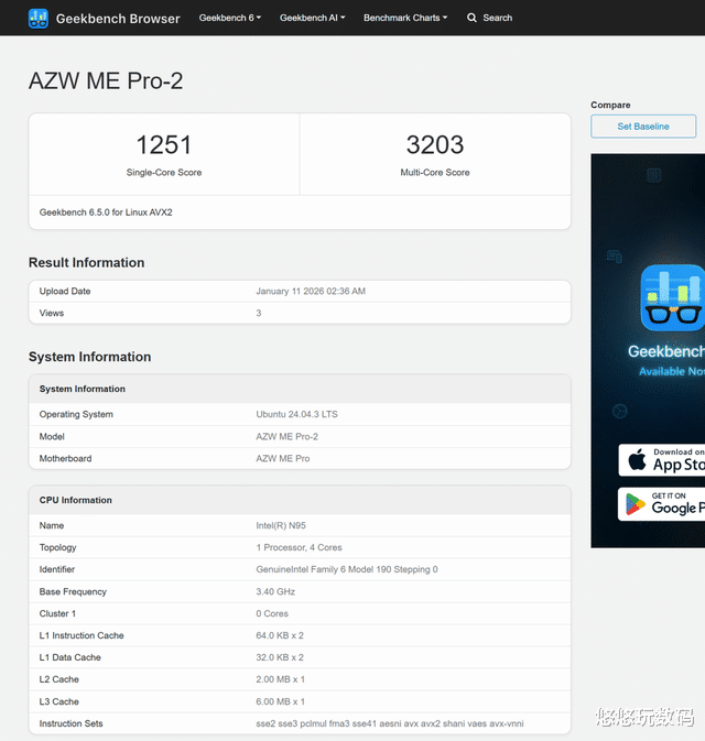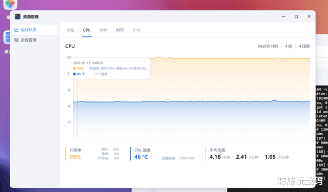 在FNOS下,实测Geekbench 6单核得分1251分,多核3203分;安装Windows系统后,双烤半小时功耗稳定在25W,CPU温度仅58℃,无明显降频现象。核显支持4K AV1、H.265等主流格式硬解码,播放4K视频时CPU占用率低,甚至能流畅应对AI相册计算等轻量图形任务。对于NAS用户而言,这样的性能足以支撑文件转码、远程访问、多设备同步等核心需求;作为办公主机,也能轻松驾驭文档编辑、网页浏览、轻度设计软件。