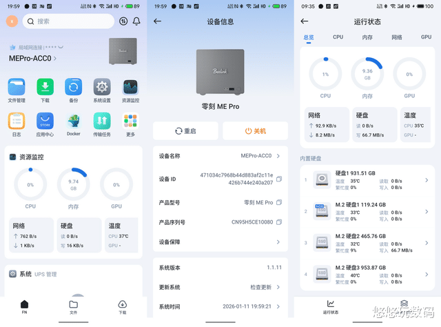 经过为期两周的深度体验,我们发现这款产品绝非简单的硬件堆砌。其创新的抽屉式硬盘仓设计让硬盘更换变得非常便捷,可拆卸主板模块支持内存与存储的升级,极大的提升了整机的可玩性。零刻ME Pro首发推出两个版本,基础版(准系统)1848元,含12GB内存,无硬盘、无系统;商业版1999元,标配128GB SSD,预装FNOS,附赠5年FN Connect高级版会员。那么,零刻ME Pro究竟是为家庭用户量身打造的实用神器,还是仅能满足极客玩家的小众玩具?