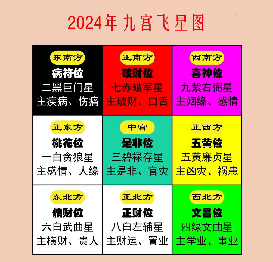 这是今年2024甲辰年的九宫飞星图,可以直接把这张图套在自家的住宅上,