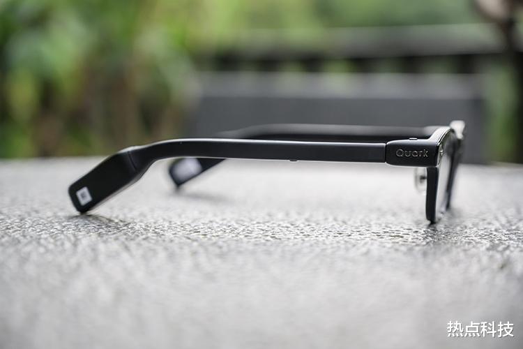 电池和处理器单元,则被设置在了镜腿尾部。这样设计有两个好处,首先呢,这部分会比较容易被头发遮挡,不显眼,这也是夸克AI眼镜能够保持纤细形态的关键。同时,分布左右镜腿的处理单元和电池,正好也成为了眼镜的配重部分,实现了1:1的前后均衡配重,这使得夸克AI眼镜佩戴起来,相比普通光学眼镜都更加稳定,几乎不会有压鼻梁的感觉,甚至日常运动,也不会掉落。