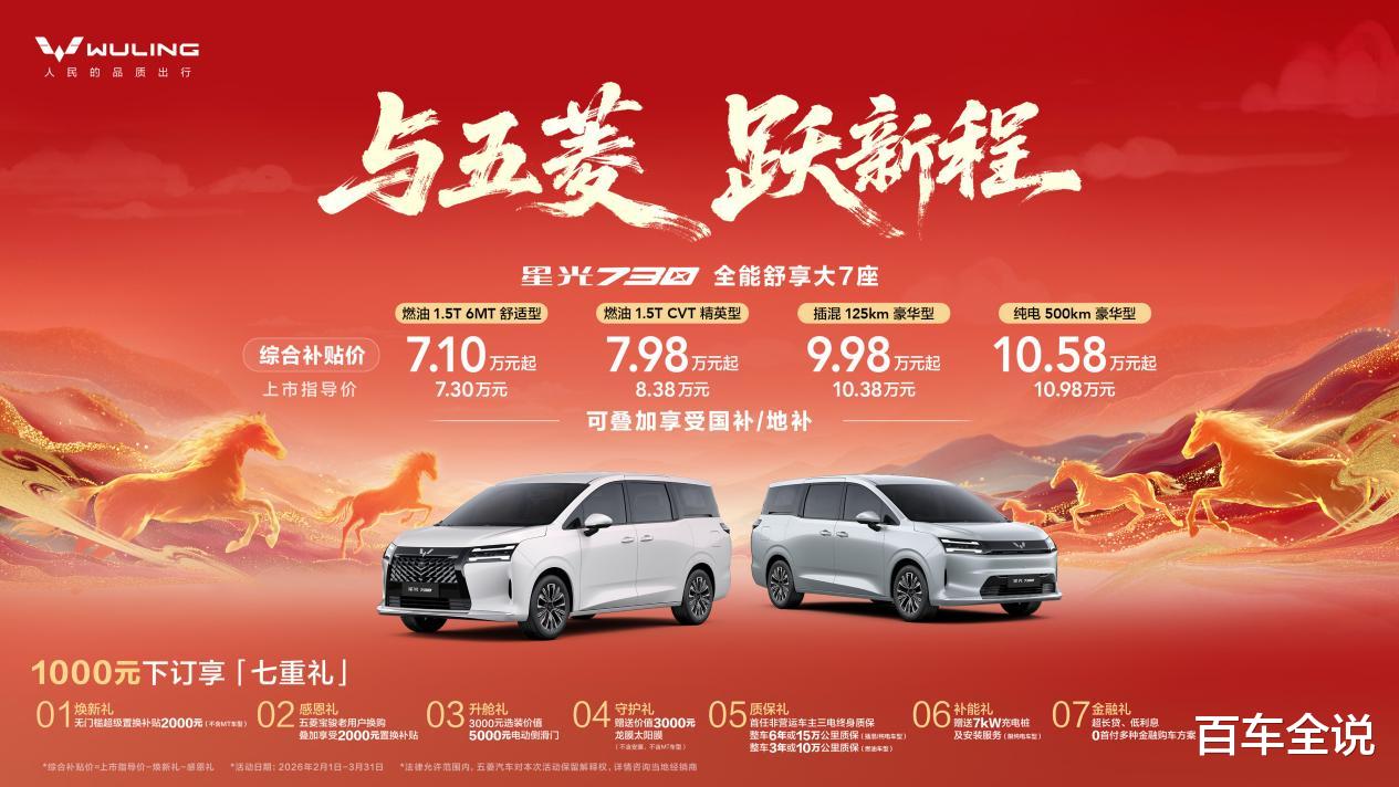 为回馈更多新老用户,五菱还带来新春购车礼遇:即日起,以1000元下订星光730,即可享2000元无门槛超级置换补贴、老用户换购叠加2000元置换补贴、选装电滑门、龙膜太阳膜、三电终身质保、充电桩、多种金融购车方案等七重礼,让「全能舒享大7座」陪伴更多家庭开启舒适团圆年。